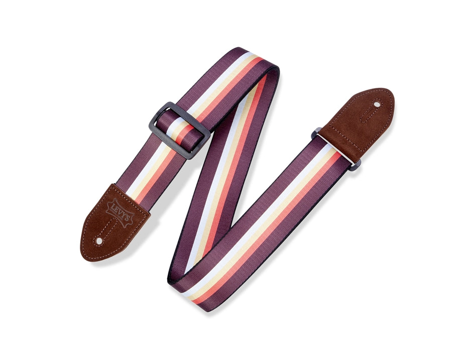 One-ply printed polyester guitar strap with suede leather ends and vintage logo. Black plastic loop and slide hardware. Adjustable from 35″ to 60″.