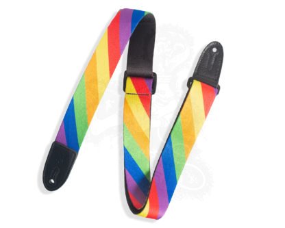 Levy’s 1.5″ kids guitar strap with printed diagonal rainbow pattern and black leather ends.