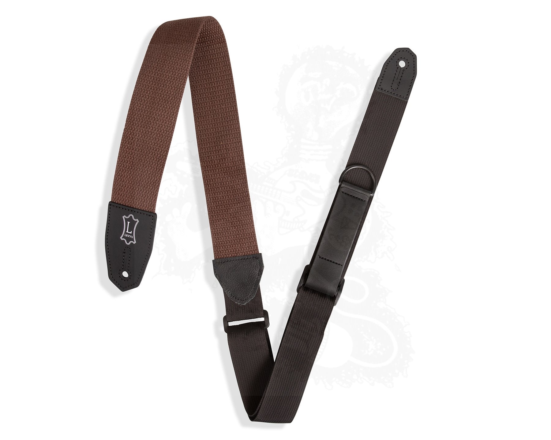 3 inch Right Height Brown Cotton Leather Guitar Strap Featuring RipChord Technology™ for Easy Adjust. Black Webbing And Leather With Polyester Webbing Adjustable From 43 to 57 inches.