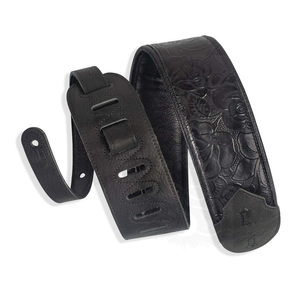 3 inch Embossed Leather Guitar Strap With Garment Leather Backing. 2-ply Strap – Distressed Rose Embossed Leather In Black And Black Soft Garment Leather Backing. Floret Stitched End Tabs. Adjustable – 37 to 52 inches.