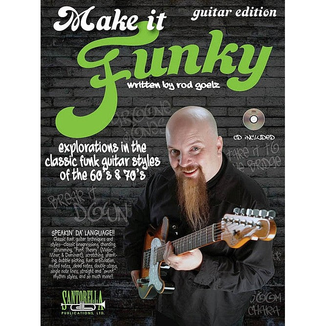 Make It Funky * Guitar Edition published by Santorella Publications is a celebratory investigation of the classic, funk guitar sounds & styles of the FUNK ERA (1965-1980). Within these 80 pages, you’ll uncover the techniques & styles of the funk-guitar masters that made it all happen by introducing the essential vocabulary necessary for playing funk-guitar. This incredible assortment includes strumming, scratching, skanking, bubble picking, funk articulation, muted notes, dead notes, and “Swunk” styles. In addition, you’ll build your understanding and application of funk-style harmony in major, minor & dominant styles. Make It Funky written by Rod Goelz is an absolute must for any serious guitar or bass student that likes to groove. The complete rhythm section performance accompaniment CD includes every example in the styles of those who made them famous. This fantastic collection features the styles of James Brown, Parliament, Funkadelic, The JB’s, Kool &The Gang, Prince, Tower Of Power, Sly &The Family Stone, The Meters, Larry Graham, The Average White Band, Rufus, Maceo Parker, The Bar-Kays, Zapp, Bernard Edwards of Chic, Ohio Players, Chuck Brown & The Soul Searchers, The Brothers Johnson, The Fatback Band and other artists from the “FUNK” era. So as James Brown would say, “Let’s Get Funky!”
