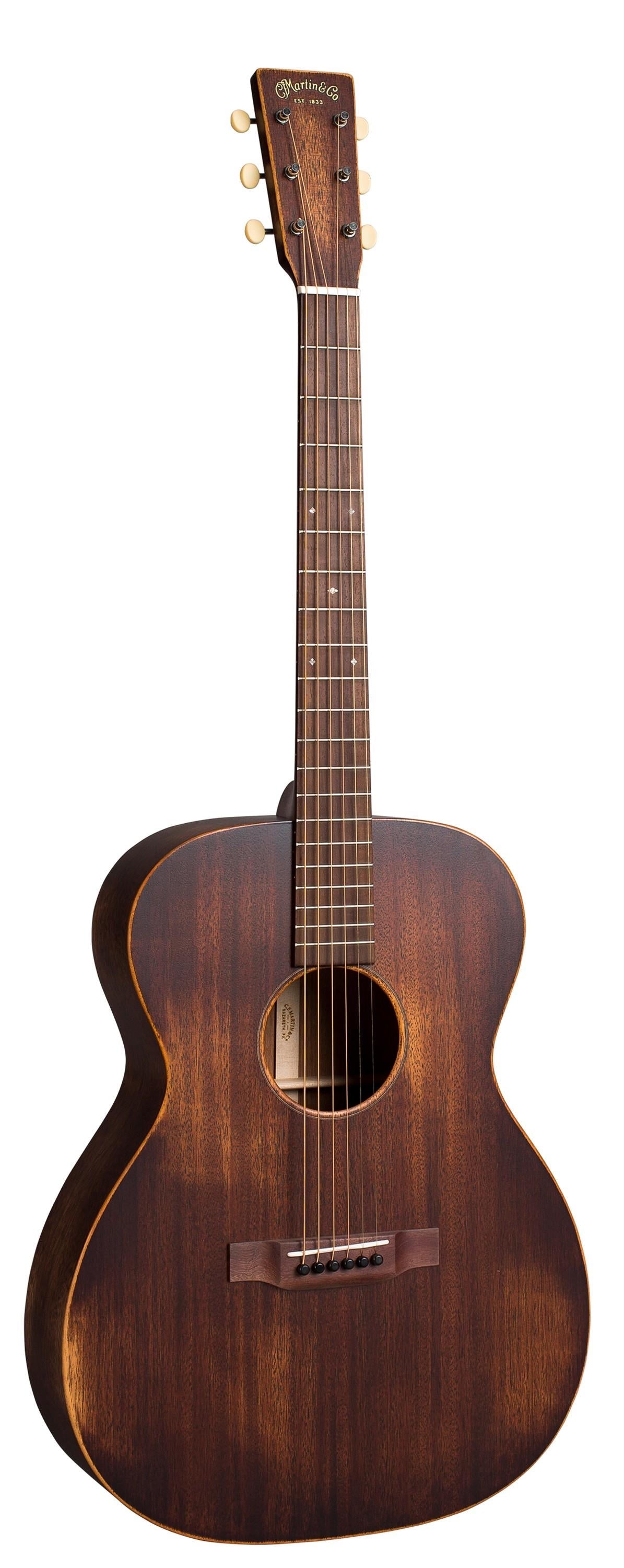 Model: 000-15M StreetMaster™ Construction: Simple Dovetail Neck Joint Body Size: 000-14 Fret Top Material: Mahogany Top Detail: None Rosette: Multi-Stripe Bracing Pattern: X Brace Brace Shape: Non-Scalloped Brace Material: Sitka Spruce Brace Size: 5/16" Back Material: Mahogany Back Detail: None Back Purfling/Strip: None Side Material: Mahogany Side Detail: None Endpiece: None Endpiece Inlay: None Binding: None Top Inlay Material: None Side Inlay Material: None Back Inlay Material: None Neck Material: Mahogany Neck Shape: Modified Low Oval Neck Taper: Standard Taper Plek: Yes Nut Material: Bone Headstock Shape: Solid with Square Taper Headplate Material: Mahogany Headplate Detail: N/A Headplate Logo Style: Script Old Style Overlay Headplate Binding Material: None Heelcap: None Fingerboard Material: Katalox Scale Length: 5.4" Neck Joins Body At: 14th Fret Number of Frets Total: 20 Fingerboard Width at Nut: 1 11/16'' Fingerboard Width at 12th Fret: 2 1/8'' Fingerboard Inlay Material: Abalone Fingerboard Inlay Style: Diamonds and Squares Short Pattern Fingerboard Binding Material: None Side Dots: Yellow Back and Side Finish: Satin Back and Sides Color: Dark Mahogany Finish Top: Satin Top Color: Mahogany Burst Finish Neck: Satin Neck Color: Dark Mahogany Bridge Material: Katalox Bridge Style: Modern Belly - Drop in Saddle Bridge String Spacing: 2 1/8'' Saddle: Compensated Bone Saddle Radius: 16" Tuning Machines: Golden Age Relic Nickel Recommended Strings: SP Acoustic 92/8 Phosphor Bronze Light (MSP4100) Knob: Cream Plastic Bridge Pin Material: Ebony Bridge Pin Dots: None Pickguard: None Pickguard Inlay: None Case: Soft Gig Bag Label: None Electronics: None