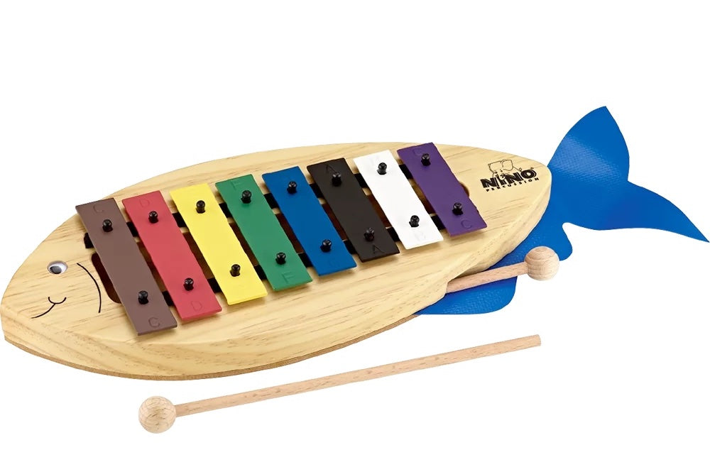 The NINO® Glockenspiel is a child-friendly way to start out with music. The jolly fish has colourful keys tuned to a scale of c d e f g a b c’. The keys may be removed for simplicity and later replaced as your child develops confidence. All corners are contained inside the rounded profile of the wooden body. The googly eye and flapping blue tail make the “Fish” Glockenspiel a charming and entertaining character!