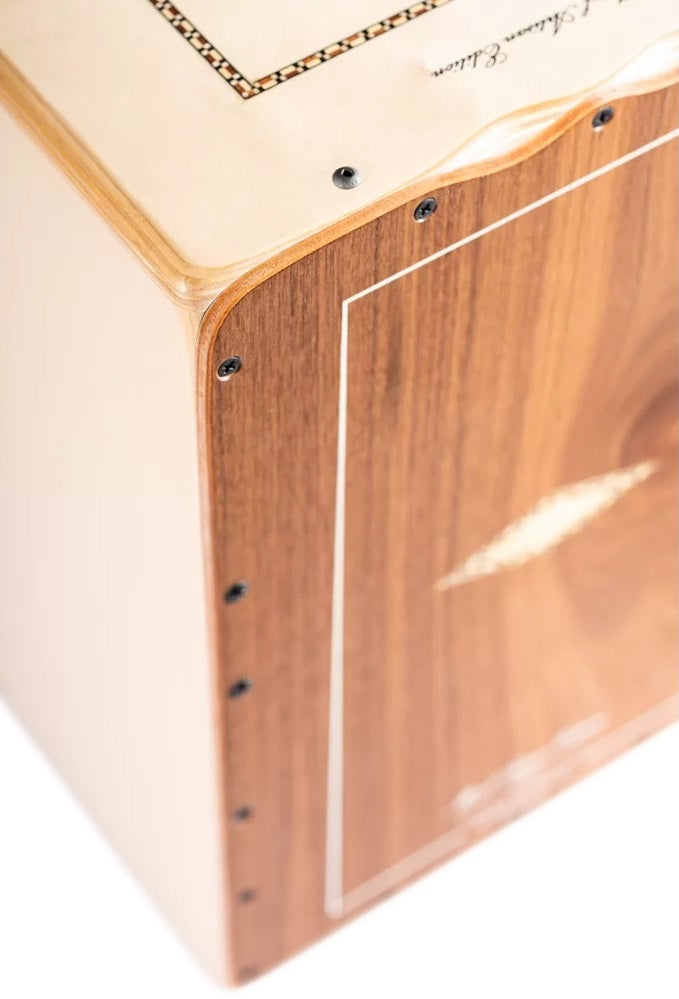 Adjustable strings and an extra thick wooden sound port ring for bass compression gives the Cantina Line a wide dynamic range of highs and lows. Two sets of eight micro-coiled metal cajon strings give a snapping snare effect and are adjustable with the included tuning key. These strings are hand-wound in the style of master cajon builder, José "Pepote" Hernández Diaz, and respond with the upmost sensitivity. The 9-Ply, 12 mm thick Baltic Birch resonating body develops the sound into a full, punchy tone that projects with clarity and warmth. A decorative wood inlay adds a touch of elegance to the overall appearance. The Cantina Line comes with a Walnut front plate. Made in Spain.