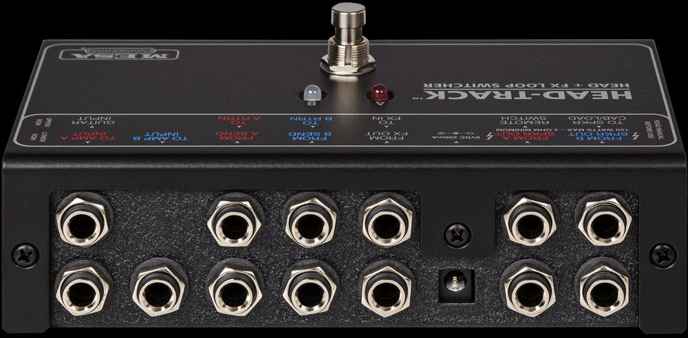 INPUTS from Instrument, Amplifier Effects Loop Sends (2), Effect(s) Output and Amplifier Speaker Outputs (2) along with OUTPUTS to Amplifier Inputs (2), Amplifier Effects Loop Returns (2), Effect(s) Input and the Speaker Cabinet Input (or Load Device) being shared are provided. The Head-Track can be powered by an external 9 Volt DC/200 mA wall-mount power supply (not included).