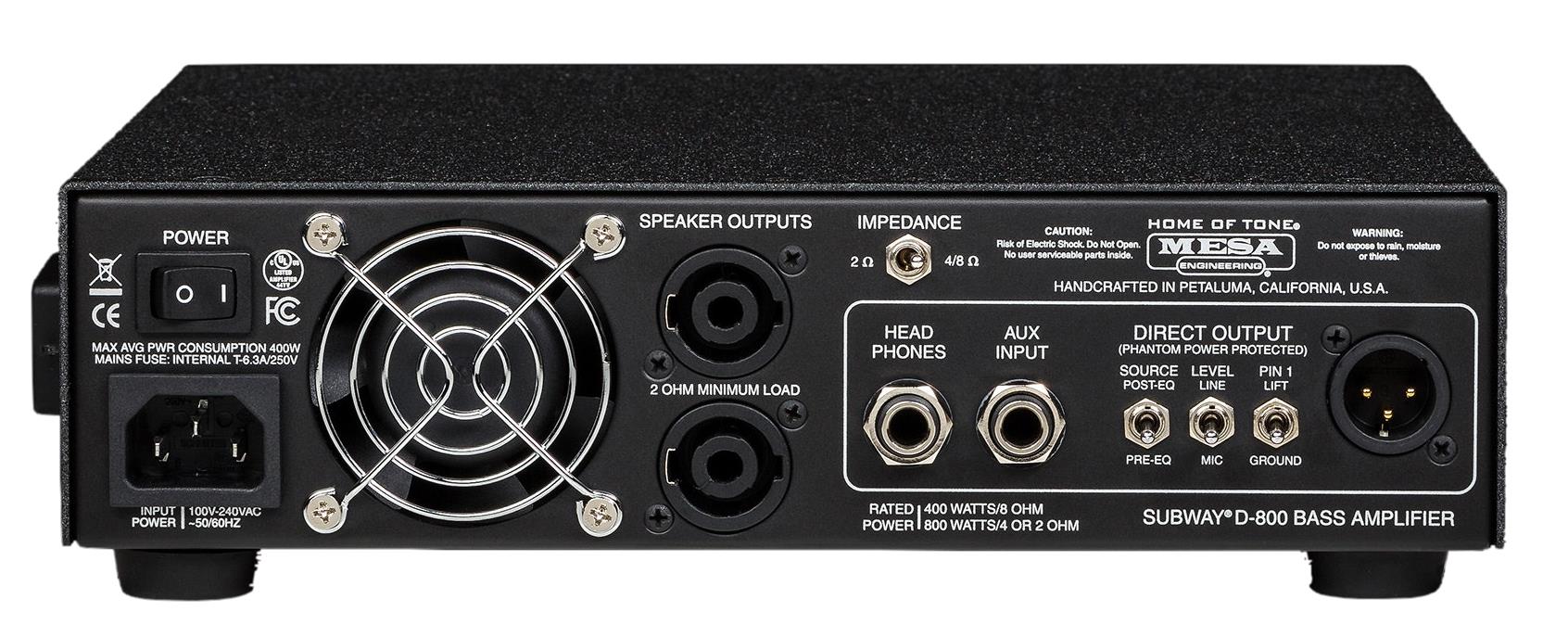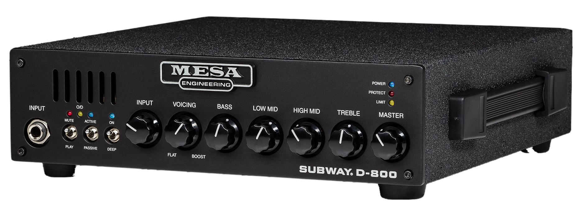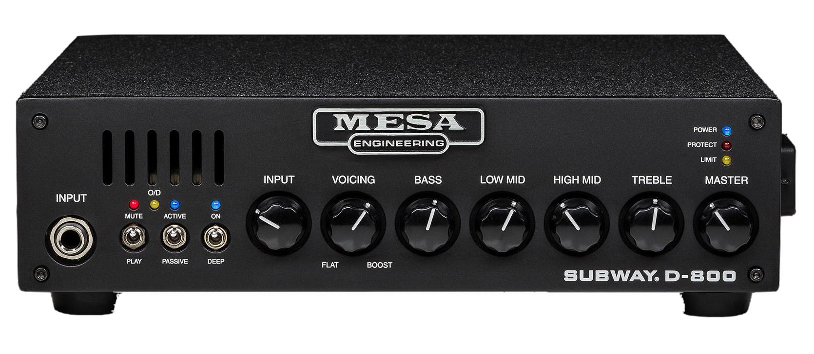 A FIRST-EVER-FOR-MESA®. THE ULTRA LIGHTWEIGHT, PROFESSIONAL LEVEL CLASS D SUBWAY® D-800™ FOR BASS Introducing the Subway® D-800™, where MESA®'s passion for Design Excellence and Portability meet the demand for Great Tone in a simple, accessible package. This first-ever-for-MESA ultra-lightweight, yet professionally power-rated Class D package for Bass boasts an easy to navigate, yet full-featured preamp with all the shaping control you’ll need coupled with a mighty 800 watt musical sounding, reliable, featherweight output section. The result is an amp that can command any venue from a small club to a large concert stage and anywhere in between, yet fits in the pocket of your gig bag! Built around a combination of signature circuits ranging from our classic tube models like the vintage Bass 400+™ and more recent Bass Strategy™ 8:88™, to the mosfet powered accuracy and mid-focused definition of the Big Block™ 750 and M9 Carbine™ the new SUBWAY D-800 embodies the best qualities from the entire MESA Bass lineage and unveils a unique new voice all its own. CONTROL OVER POWER Subway D-800 Bass Amp Mute Active Passive Switch Tone shaping in the SUBWAY D-800 begins with the Front Panel INPUT section, which is comprised of the INPUT jack and two switches; a MUTE and an ACTIVE/PASSIVE switch for tailoring the input headroom to your instrument. The MUTE switch silences the signal from the INPUT jack to the SPEAKER output, HEADPHONE output and DI output for silent tuning. Convenient Indicator LEDs are provided on the right side of the Front Panel for all switched functions. Subway D-800 Bass Amp Rotary Voice Control VOICE CONTROL on the SUBWAY D-800 is a continuously variable rendering that allows fine-tuning of your sound from a more “flat” response to a radically scooped midrange sound with the lows and highs boosted. DEEPER STILL Still not enough bottom you say… we listen and obey. For all those who need that extra huge Tone, we’ve included a DEEP switch that further enhances low end and puts an unmistakable sub-low component into the mix. 4-BAND EQ Further Tone shaping is handled by our 4-Band Fixed, Rotary EQ Section comprised of BASS, LOW MID, HIGH MID and TREBLE Controls. While the BASS and TREBLE controls deliver sweet, musically useful regions of low end fundamental and top end clarity, it’s the two powerful overlapping MID Bands that allow pinpoint accuracy when sculpting the important attack region and body of your Tone. LOW MID fills in the higher bottom end and determines fullness and bloom, while the HIGH MID helps you define how your sound tracks with the drums and where you want to sit in the mix. With these four controls as your foundation and the VOICING control as the finishing touch, or even vice versa, any sound you desire is only a quick twist away. FIND YOUR VOICE While VOICE controls have appeared on several MESA Bass designs, here on the SUBWAY D-800, we opted for a continuously variable rendering that allows fine-tuning of your sound from a more “flat” response to a radically scooped midrange sound with the lows and highs boosted. This sweep-able version of the VOICING control allows near infinite shaping and let’s you decide the degree of “sauce” that’s right for your individual Bass and musical style. CONNECTIVITY Pro features are abundant on the D-800 Rear Panel and all of your interfacing needs are provided for here. SPEAKON SPEAKER OUTPUT jacks allow sturdy connection to the enclosure of your choice. An IMPEDANCE switch allows you to optimize the SUBWAY’s mighty output power for a variety of speaker configurations and wiring schemes. Regardless of your impedance requirements, the SUBWAY delivers its authoritative power and great Tone in full measure. Subway D-800 Bass Amp Headphone Out HEADPHONE and AUX INPUTS are provided so you can enjoy the SUBWAY’s great sound without disturbing others. Further inspiration is available for solo enjoyment by connecting pre-recorded music, a sequencer or a drum machine to the AUX Input and playing to accompaniment while using headphones. PRACTICE PRIVATELY, PLAY PRIVATELY. OUTPUT FOR ALL Subway D-800 Bass Amp Direct Out DIRECT OUTPUT - A standard XLR D.I. OUTPUT provides switching for pre/post routing, mic or line level output and a ground switch to aid in curing ground noise problems when interfacing with other gear. A HEADPHONES OUTPUT is provided so you can enjoy the SUBWAY’s great sound without disturbing others. Further inspiration is available for solo enjoyment by connecting pre-recorded music, a sequencer or a drum machine to the AUX Input and playing to accompaniment while using headphones. A comprehensive DIRECT OUTPUT section is included in the SUBWAY’s platform so you can share your Tone with the world of recording and/or reinforcement and provides a full set of options for your D.I. needs. The standard MALE 3-Pin XLR is controlled via 3 mini toggles that determine both SOURCE (PRE or POST) and LEVEL (MIC or LINE) as well as a PIN 1 LIFT option on the XLR to aid in curing Ground noise problems when interfacing with Consoles of all types. FEATURES Made in Petaluma, CA USA with the World's Finest Materials Class D Power with 8/4 or 2 Ohm Impedance Switch for optimum Power to Load Performance 800 Watts @ 4 or 2 Ohms (400 @ 8) Active/Passive Input Switch Play/Mute Switch Preamplifier features: Input Gain with Clip Indicator (O/D LED), Variable Voicing (Flat to Vintage Scoop), Fully Active 4-Band EQ (+/- 12dB of Bass, Low-Mid, High-Mid, Treble) plus Deep Switch (for enhanced low-end) and Master Volume Balanced XLR Line Out with Pre/Post, Line/Mic & Ground Lift Switches Headphone Output Auxiliary Input Protection & Limit LED Indicators 2 Speakon Speaker Output Jacks Fan Cooled Gig Bag w/Strap