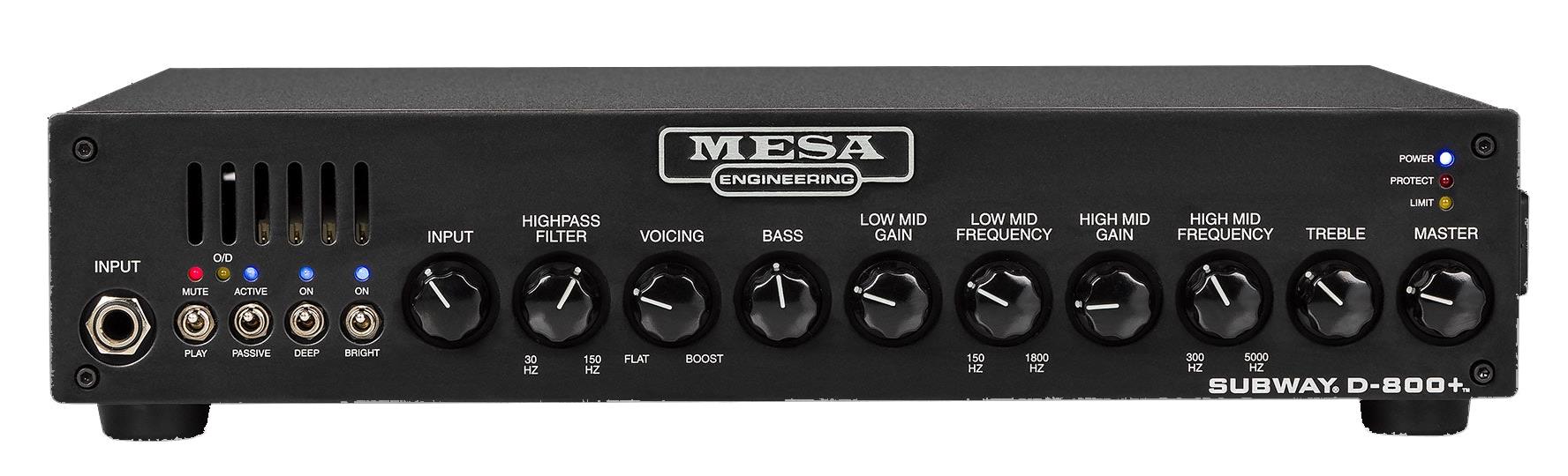 UPGRADED FEATURES FOR MORE TONAL CONTROL AND AN INTERFACE FOR OUTBOARD SIGNAL PROCESSING The SUBWAY D-800 addresses the player who wants enhanced frequency control and an interface for outboard signal processing. The upscale D-800+ preamp features expand upon the acclaimed D-800 by including a comprehensive EQ section with Semi-Parametric sweep-able LOW and HIGH MID Bands, the addition of a BRIGHT switch, an adjustable HIGH-PASS Filter with control from 30Hz to 150 Hz, and on the Rear Panel, a Series Effects Loop, Tuner Output and 1/4†MUTE footswitch jack. Mesa Subway High Pass Filter The D-800+ upgrades include an adjustable HIGH-PASS Filter that allows control over the sub-lows in your mix from 30Hz to 150 Hz to achieve the tightest response, most detailed articulation and maximum headroom in an ensemble scenario or large venue application. Either way you get there, the straight ahead and beautifully simple D-800 or the upscale, fully featured D-800+, the SUBWAYS deliver nuance-rich Tone, stunning power and headroom and a blend of flexibility and portability that would be any Bassist's dream ride to musical inspiration. FEATURES Made in Petaluma, California with the World's Finest Materials Class D Power with 8/4 or 2 Ohm Impedance Switch for optimum Power to Load Performance 800 Watts @ 4 or 2 Ohms (400 @ 8) Active/Passive Input Switch Play/Mute Switch Preamplifier features: Input Gain with Clip Indicator (O/D LED), Variable High-Pass Filter (30Hz - 150Hz), Variable Voicing (Flat to Vintage Scoop), Fully Active 4-Band EQ (+/- 12dB of Bass, Low-Mid, High-Mid, Treble) with Sweepable (variable) Low-Mid (150Hz-1800Hz) & High-Mid (300Hz-5000Hz) Frequency Controls with Deep Switch (for enhanced low-end) & Bright Switch (for enhanced top-end) and Master Volume Balanced XLR Line Out with Pre/Post, Line/Mic & Ground Lift Switches Series FX Loop Tuner Output (back panel) Mute Footswitch Jack (footswitch sold separately) Headphone Output Auxiliary Input Protection & Limit LED Indicators 2 Speakon Speaker Output Jacks Fan Cooled Gig Bag w/Strap FORMAT Weight: 6.3 LBS. Dimensions: 2.625" H x 13.25" W x 10.15" D