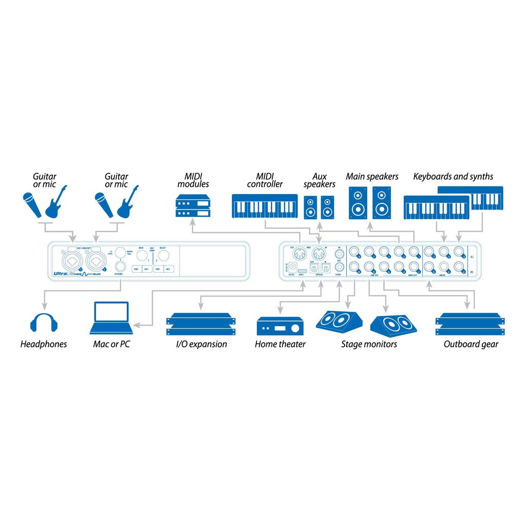 Connect all of your audio gear, including speakers, headphones, mics, guitars, synths, keyboards, drum machines, effects processors and even MIDI devices.