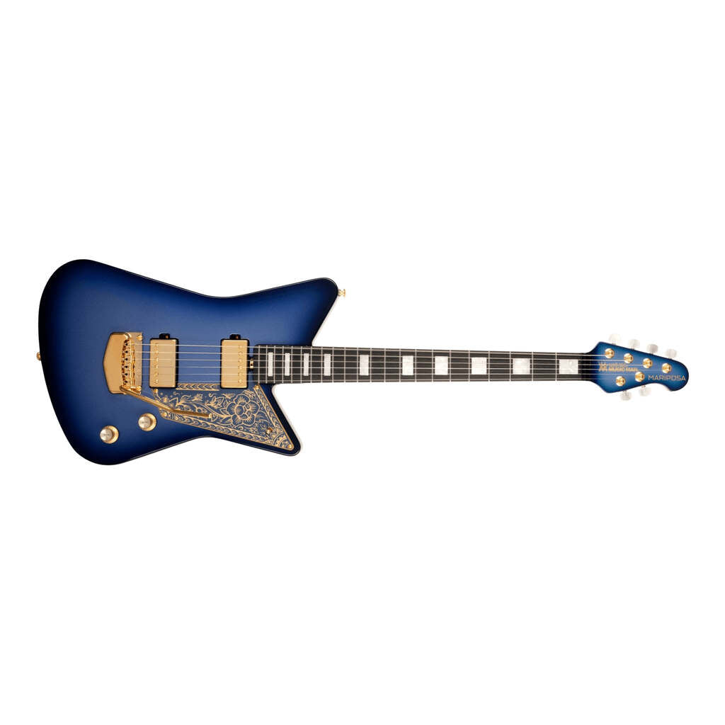 The Mariposa features an offset lightweight okoume body, a roasted maple neck, and an ebony fingerboard that showcases pearlescent style block inlays. Electronics include two custom wound EBMM humbucking pickups with separate volume control for each pickup, controlled by a 3-way pickup selector switch that allows for variable humbucking combinations when needed. The pickguard is laser etched with an ornate design coordinated to compliment specific finish options.