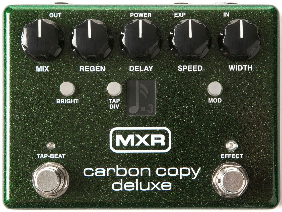 The Carbon Copy Deluxe Analog Delay adds a bevy of new features to fine-tune the warm, organic sound that has made the original the bestselling analog delay in the world. With extended delay time—now up to 1.2s—and tap tempo functionality, you now have more control over your Carbon Copy repeats than ever. The Tap Division feature, with an easy-to-read status display, gives you four different subdivisions: dotted 8ths, 8ths, triplets, and 16ths. On the tonal side, the Carbon Copy Deluxe Analog Delay lets you choose between the original’s dark, mellow wash and the vibrant articulation of the Bright version with the push of a switch. To add further character and texture to your repeats, just hit the Mod switch and use the Speed and Width controls to shape the chorusing to your taste. Additional features include an expression jack for external control of various functions, programmable presets, and more. Inside the pedal is a Line Level/Instrument Level switch—which allows the pedal to be used either in front of the amp or in the FX loop—and a Dry Kill switch for a “wet only” effect that’s perfect for studio recording. With true bypass switching, 9-volt battery operation, and MXR’s famously rugged construction, the Carbon Copy Deluxe Analog Delay is a must-have for delay aficionados.