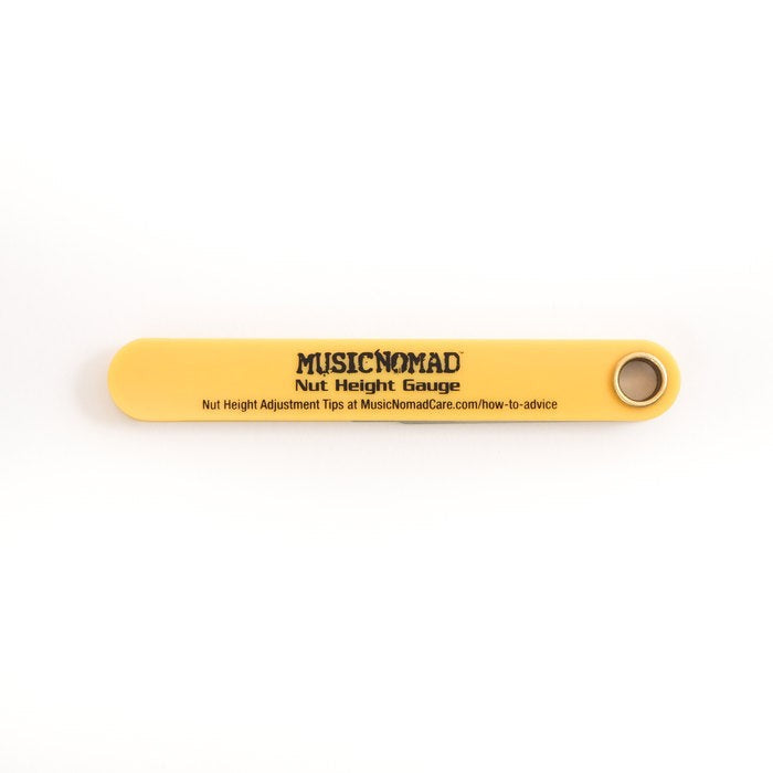 Being able to measure your string height at the nut is a critical step in the setup process. MusicNomad’s Precision Nut Height Gauge will help you do it quickly & accurately. The gauge comes equipped with the 3 most common nut height sizes (0.016”, 0.018”, 0.020”) plus 3 additional sizes (0.012”, 0.014”, 0.022”) to accommodate a desire for lower action or a heavier pick attack. Instructions printed right on the handle makes it extremely easy to dial in your nut height. It’s perfect for electric, acoustic, classical & bass guitars & features laser-etched markings that take the guesswork out of which gauge to use for each instrument. It’s made of premium stainless steel construction without the annoying, messy oil found on traditional feeler gauge sets. That's MusicNomad quality – raising the bar in equipment care.