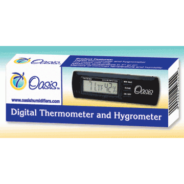 A guitar, or any other stringed musical instrument made of wood, is at risk of cracking when the relative humidity drops below 40%. The Oasis® Digital Hygrometer accurately measures relative humidity and can help you decide when to use your Oasis® Guitar Humidifier. Because relative humidity varies greatly, even inside your home, we recommend that you keep your hygrometer close to your instrument.