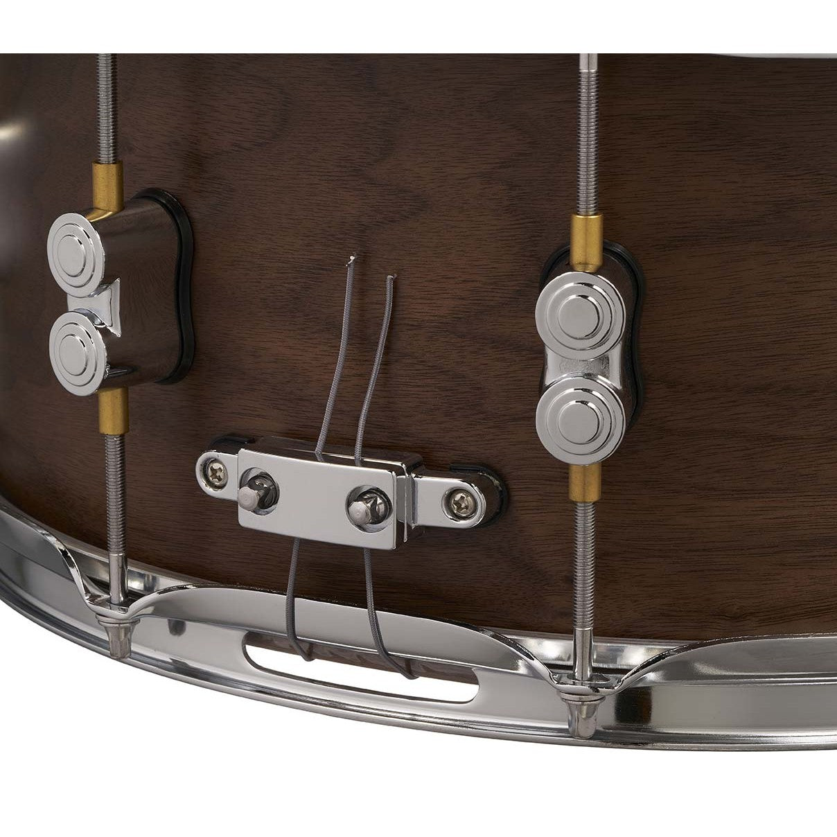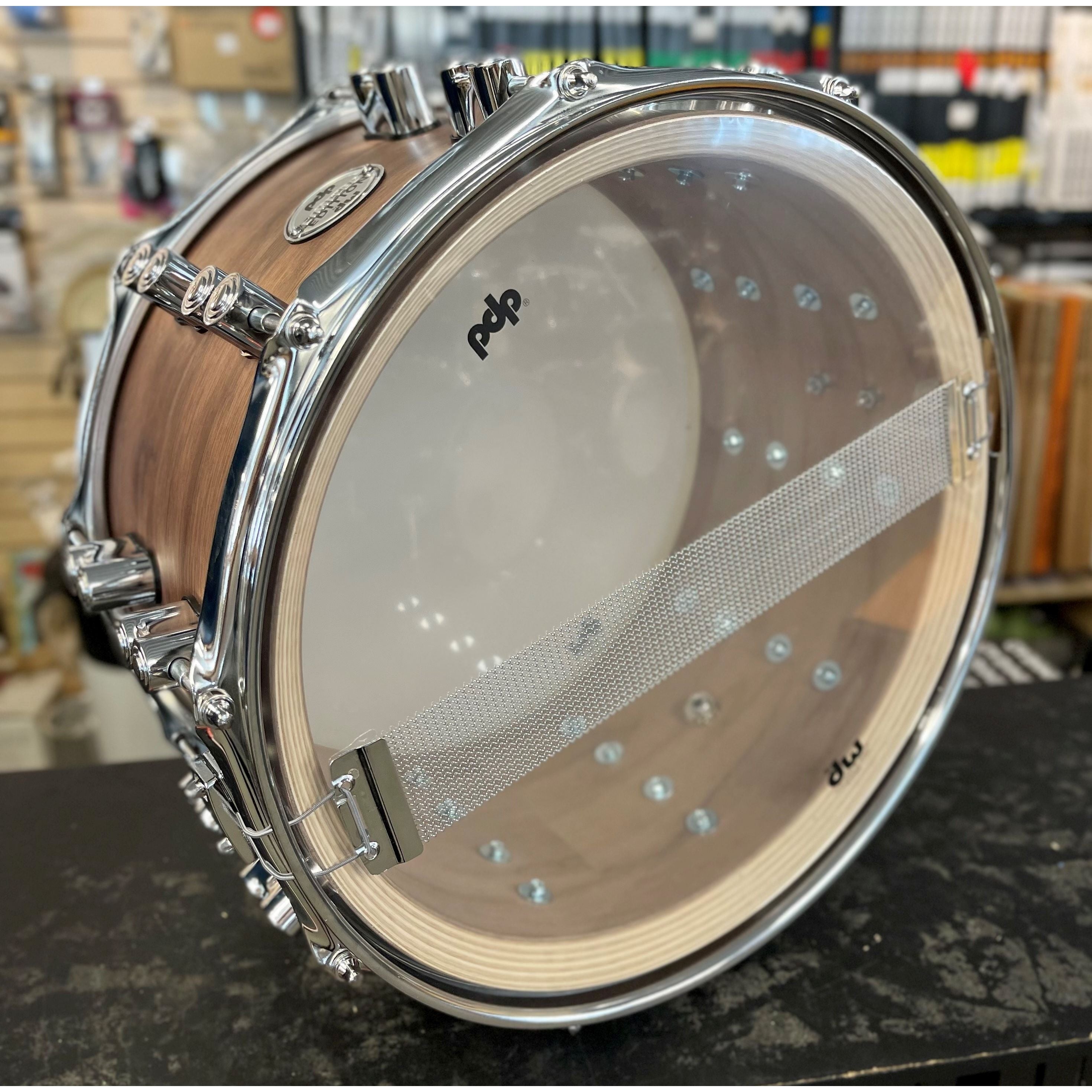This 8”x 14” (PDSN0814MWNS) 20-ply hybrid shell snare drum is a welcome addition to the complete line of PDP offerings. The ultra-thick drum is made with 16 plies of European maple at its core and 4 plies of walnut both inside and outside. Outfitted with a MAG throw-off and distinct dual-turret lugs, this snare produces a fat, throaty sound with a pronounced attack.
