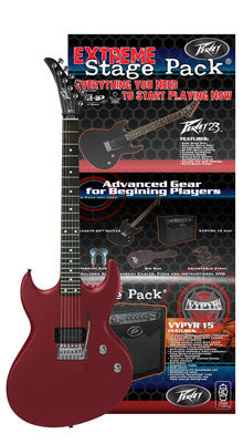 The most advanced 15w modelling amp on the planet in a pack! Featuring the Vypyr 15 and Peavey PXD 23 guitar, the Vypyr stage pack is every aspiring metal rock gods dream. With 24 amp channels, 11 effects, 12 presets, WYSIWYG interface, and of course patented Peavey Transtube technology, the Vypyr 15 is truly 21st century state of the art. The PXD 23 guitar is a 24 fret, hum-cancelling pickup hammer of the gods, with solid construction and blade style tremolo bridge. The guitar is available in either satin black or blood red. Combine the Vypyr 15 and the 23 guitar and you have the makings for the industrys most exciting electric guitar stage pack.