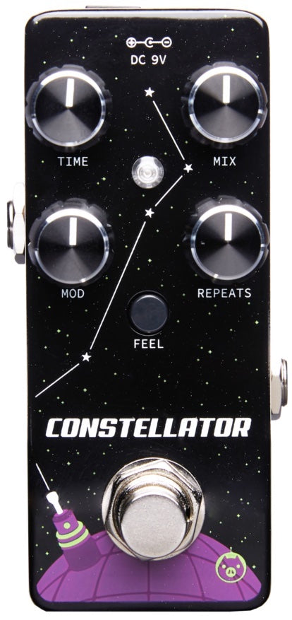Constellator is an all-analog delay pedal capable of producing up to 600ms of lush echo with adjustable modulation and a comprehensive sound palette. From percussive slapback and doubler sounds to chorused-out, long delays with endless repeats, the Constellator’s MN3005 bucket brigade chips provide superior overall headroom and tape-like saturation when pushed to the limit. The Feel toggle switch adjusts several parameters simultaneously for an additional coloring of LFO modulation. With the Feedback control maxed out, the Constellator is capable of self-oscillation which can be pitched up or down by turning the Time knob. Runs on standard 9VDC.