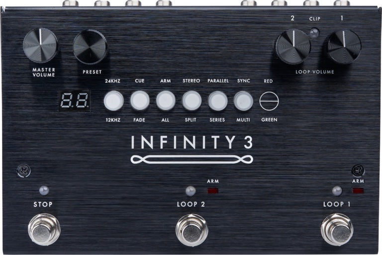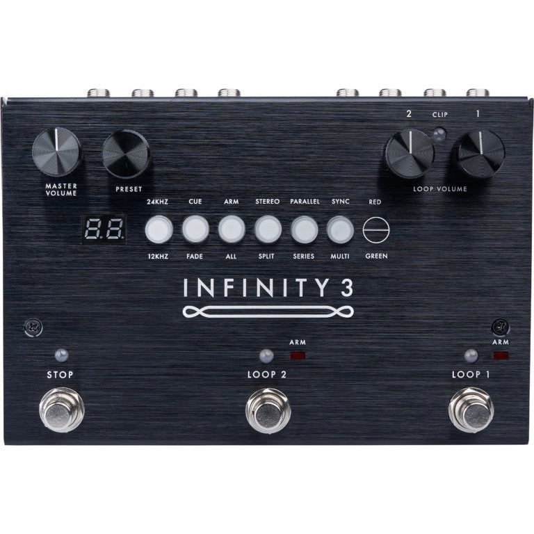 Infinity 3 is the world’s most musical looping pedal. Simple to operate, yet tremendously powerful and flexible, the Infinity 3 guarantees latency-free looping. Our state-of-the-art platform provides instantaneous record, playback, dub, undo and redo, on two stereo loop pairs that can be played in series or parallel as well as synchronized and cue'd for automatic playback. On top of superior speed and a unique, performance-friendly feature set, Infinity 3 sounds downright incredible thanks to its discrete analog limiter stages, transparent analog pass-through and 24 bit HD recording engine with variable sample rate that can be incremented in semi-tones over two octaves. With approximately 3 hours of recording time on up to 50 loop pairs, the Infinity 3 was designed to inspire compositional depth and engaging performances. Comprehensive MIDI control and intelligent MIDI clock jitter correction provide the ability to link the Infinity 3 to a DAW, Drum Machine or other effects pedals. Infinity 3 is the ultimate tool for writing, rehearsing and performing every style of music.