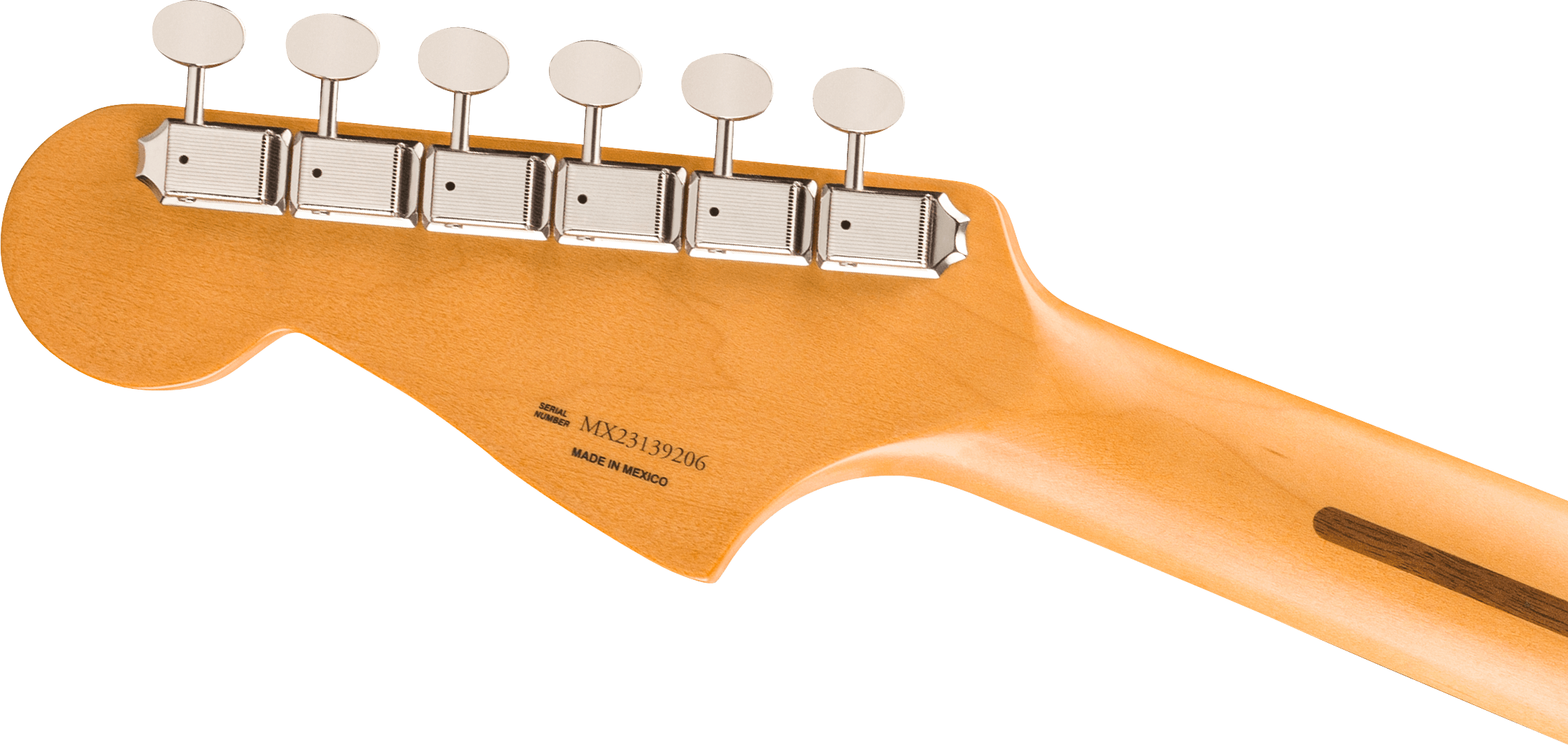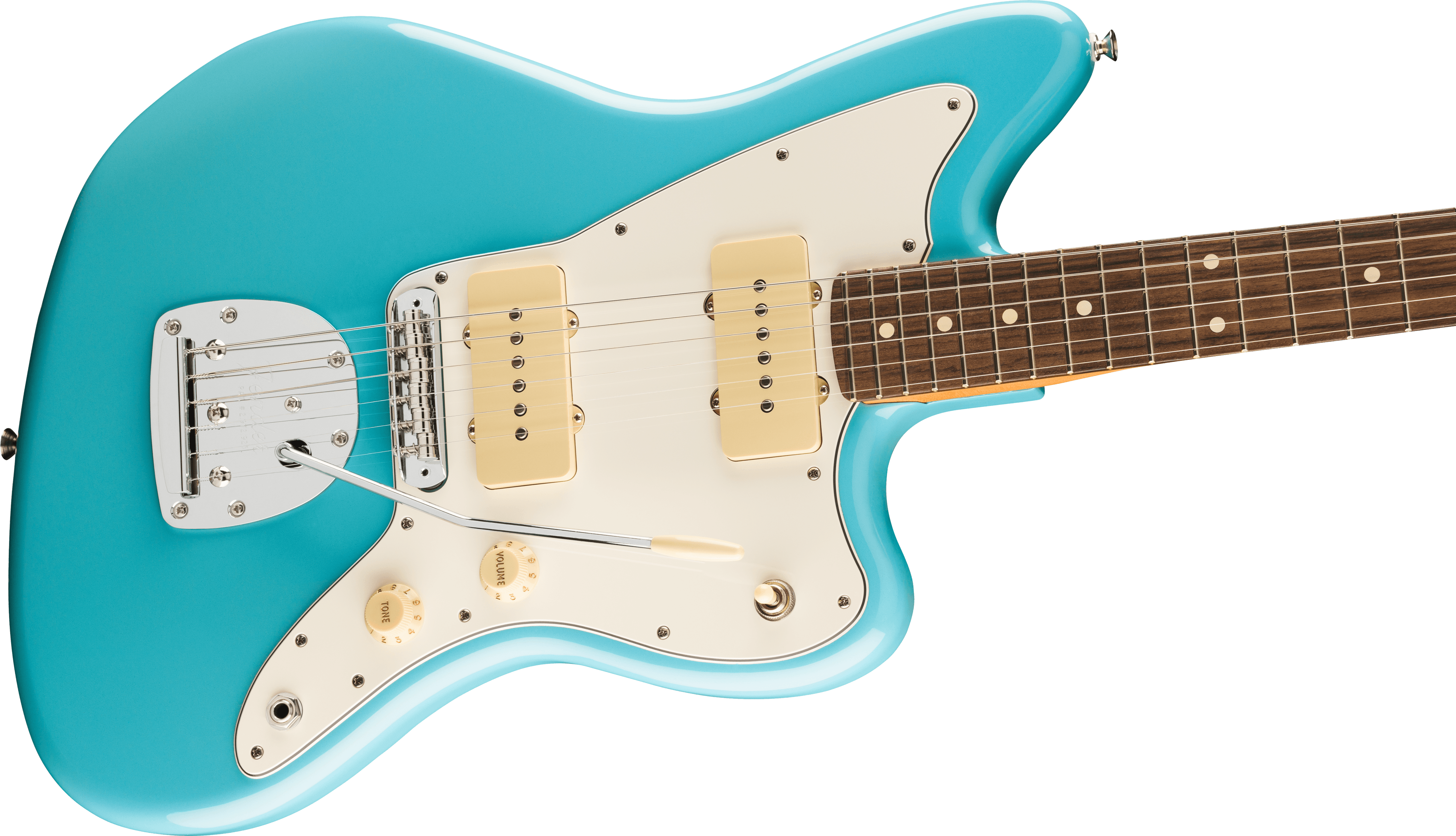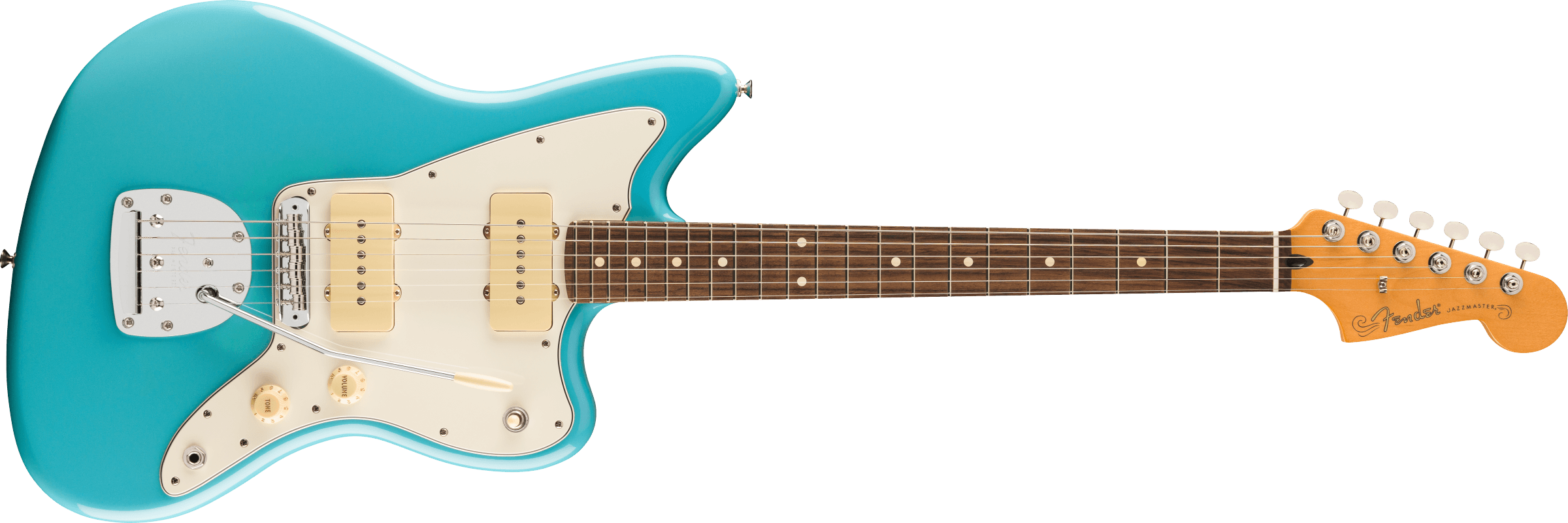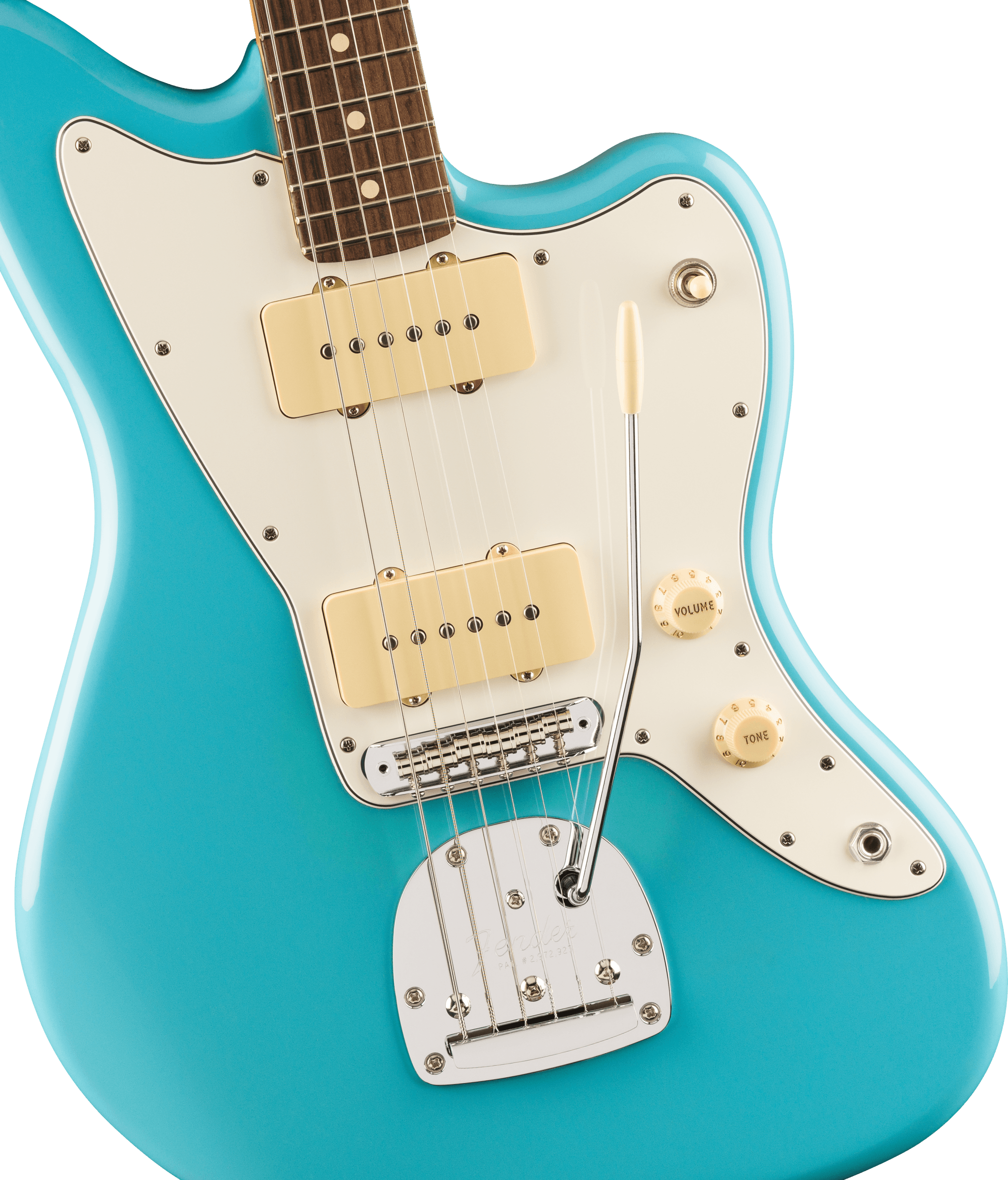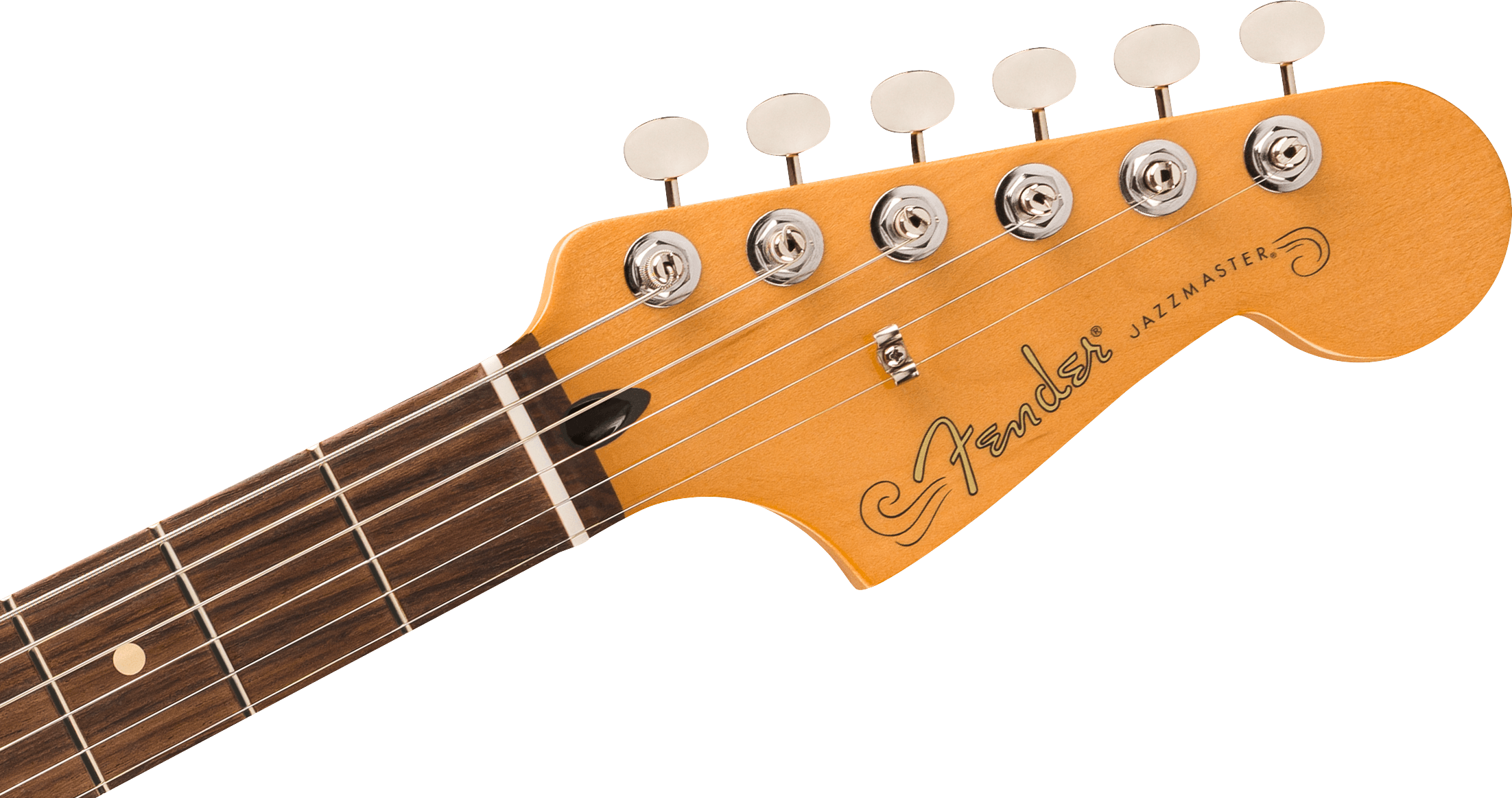 The Player II Jazzmaster radiates timeless Fender charm, but under the hood, it's primed for today's players. Everything about the neck is designed for fast and fluid playability, from the Modern “C”-profile with silky satin urethane finish on the back to the comfy 9.5”-radius slab rosewood fingerboard with smooth rolled edges and 22 medium jumbo frets. A classic alder body is available in both timeless Fender finishes and never-before-seen colors unearthed from the archives. Player Series Alnico V Single-Coil Jazzmaster pickups offer crystalline highs, musical mids and tight lows that elevate any genre. The 3-way toggle switch lets you easily dial in everything from glassy neck pickup chime to cutting bridge pickup bite and all points in between, while a 6-saddle Jazzmaster bridge with Floating Tremolo, upgraded Mustang® saddles and ClassicGear™ tuners ensure precise tuning stability for the flexibility to explore endless sonic possibilities.