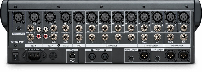 Features 8 mono mic/line channel inputs, each with: High-headroom Class A XMAX mic preamplifier XLR mic and balanced ¼-inch line inputs 60 mm precision fader 4 stereo line channel inputs, with: High-headroom Class A XMAX mic preamplifier (Ch. 9, 11, 13, and 15) XLR mic inputs (Ch. 9, 11, 13, and 15) Balanced ¼-inch line inputs (Ch. 9-16) Unbalanced RCA line inputs (Ch. 13-16) 60 mm precision fader (4 stereo) 4 Auxiliary buses (pre/post-fader send) 2 Internal FX buses 2 stereo 32-bit digital effects processors with customizable reverb and delay presets Fat Channel signal processing on all channels and buses, with: 3-band semi-parametric EQ (individual band on/off) Full-featured compressor Standard downward expander Limiter Phase reverse (12 mic preamplifiers only) Pan with dedicated 15-LED display Stereo link for input channels and aux buses Highpass filter One 31-band stereo graphic EQ (on main outputs only) 18-in/16-out USB recording interface (24-bit/44.1 kHz and 48 kHz) Compatible with most audio software via ASIO, Windows Audio, Core Audio Scene store and recall Settings can be copied among channels and buses and saved as user presets. Software bundle includes: PreSonus® Studio One® Artist digital audio workstation for Mac® and Windows ® PreSonus Capture™ live-recording software for Mac and Windows PreSonus UC Surface mixer-control software for Mac, Windows, Android™, and iPad® Free downloadable PreSonus QMix®-UC software for iPhone®/iPod touch® and Android™ provides wireless remote control of aux mixes Lockout mode protects your settings from meddlers and accidents MIDI Control Mode provides control over:Scene and FX Preset recall. Main Volume, FXA, and FXB output levels. FXA and FXB assign/unassign to Main