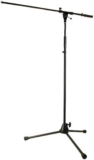 Tripod microphone stand with arrow. This rugged stand features a metal tripod base, chrome angle adjustment, and black finish. This booth now features a colorful box, beautifully designed to incorporate the stand's image for merchandising and easy selling.