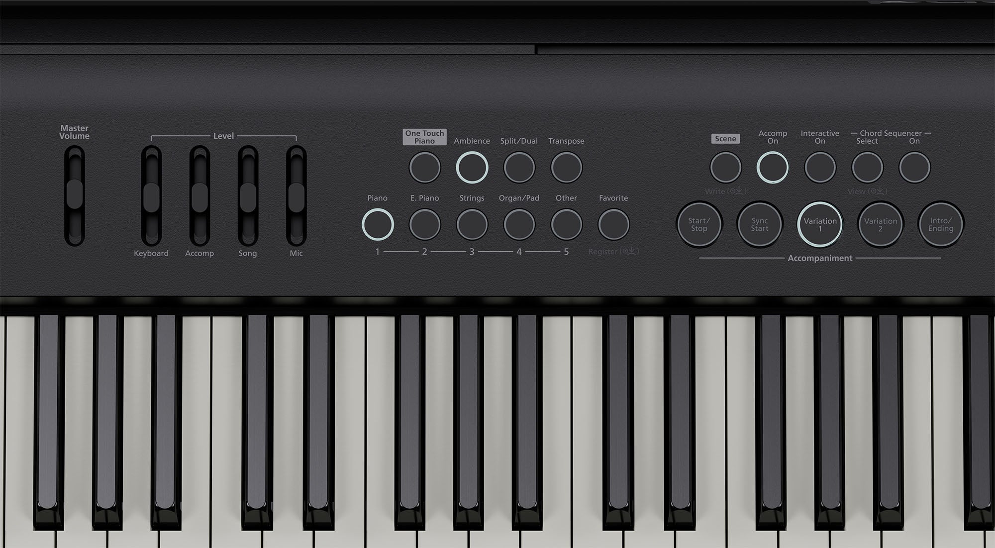 While the FP-E50 is filled with advanced features, getting around on the instrument is frustration free. The top-level display shows sound, tempo, and other essential information, and the clean panel layout provides direct access to sound selection, favorite tones, keyboard transposition, and more. Many buttons include long-press functions, allowing you to save settings or tweak deeper parameters without menu diving. And with Scenes, you can instantly recall complete setups for the entire keyboard using single actions.