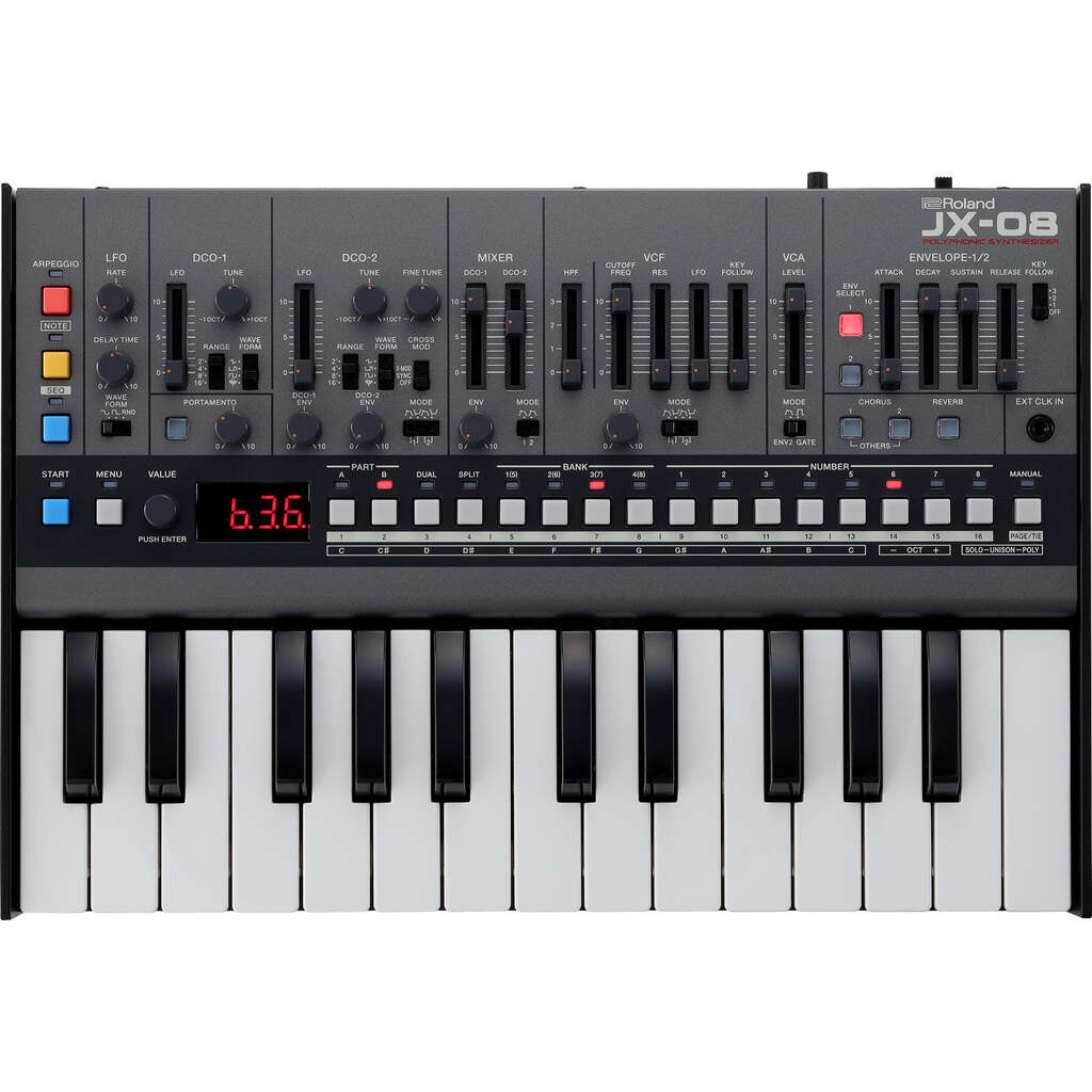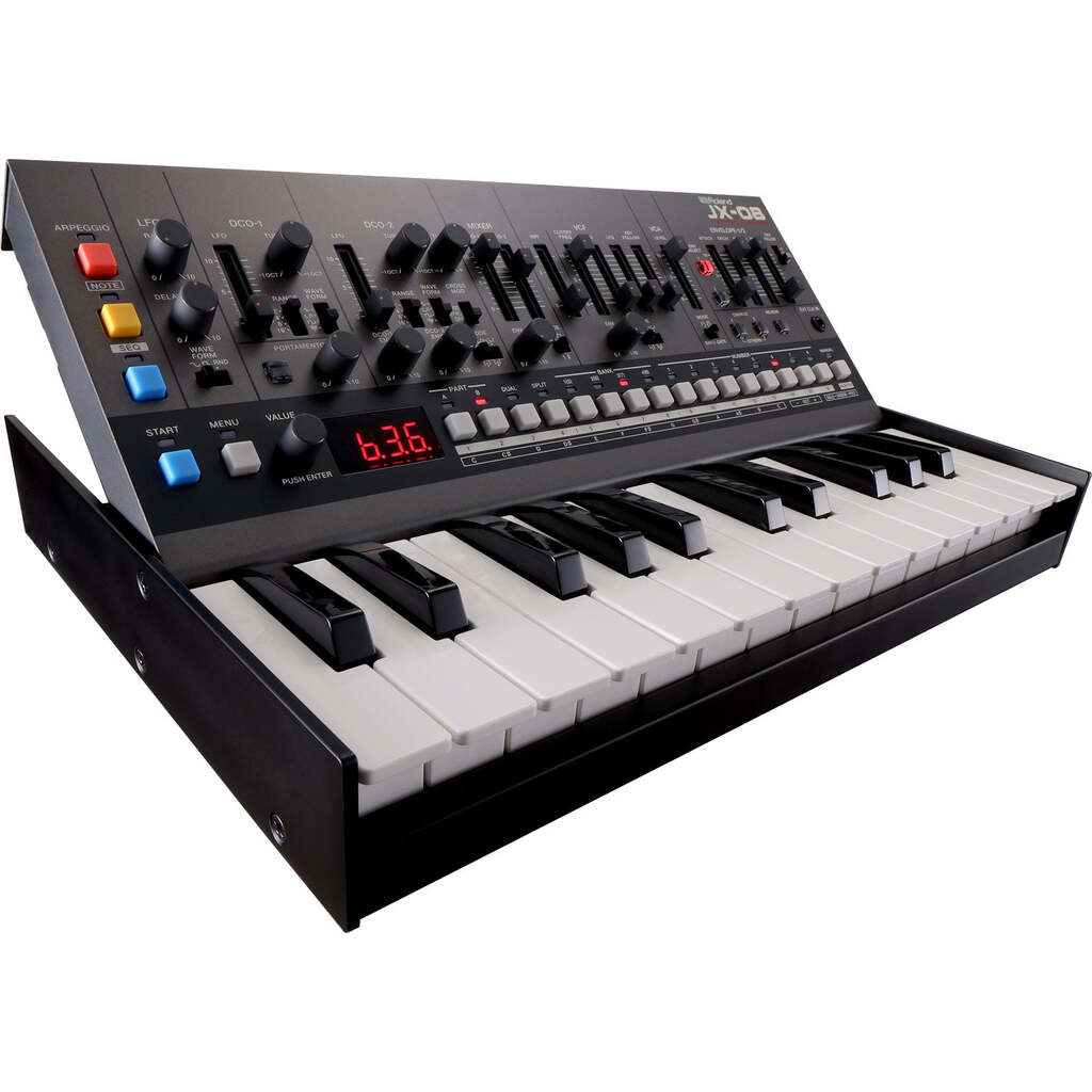 In 1985, Roland’s innovative JX-8P took hybrid synthesis a step further with a compelling new analog-digital voice. The instrument was instantly embraced by top session players, who forever embedded its warm pads, shimmery chorus, and crystalline textures into the era’s most popular tracks. The JX-08 reintroduces the unique sound of this sought-after classic in stunning detail, coupled with powerful new effects, a polyphonic sequencer, and more. And to enhance your creative flow, there’s a full panel of hands-on controls derived from the companion PG-800 programmer unit for the original hardware.