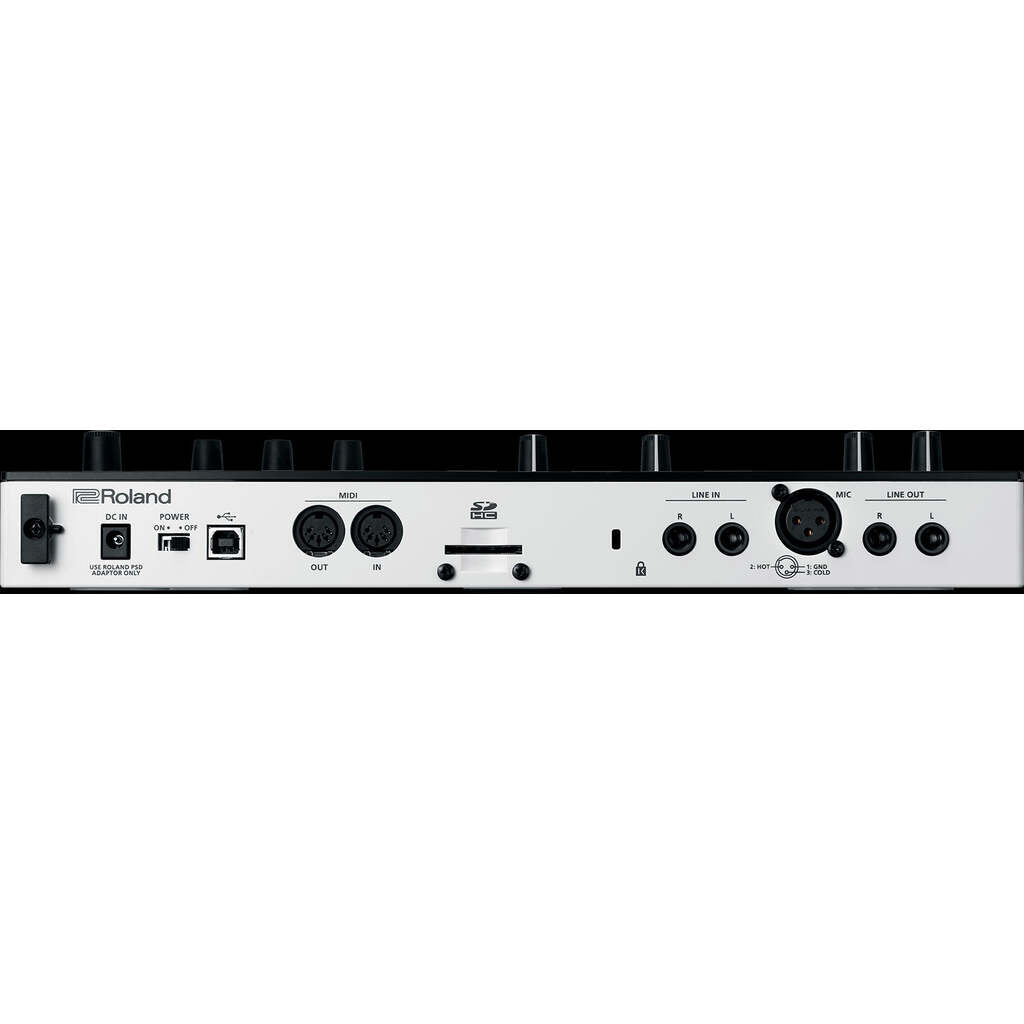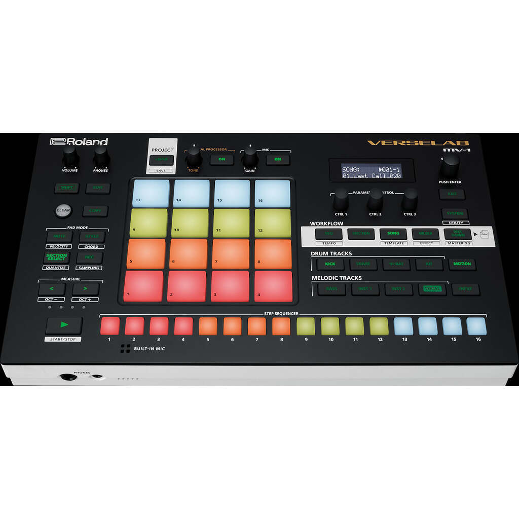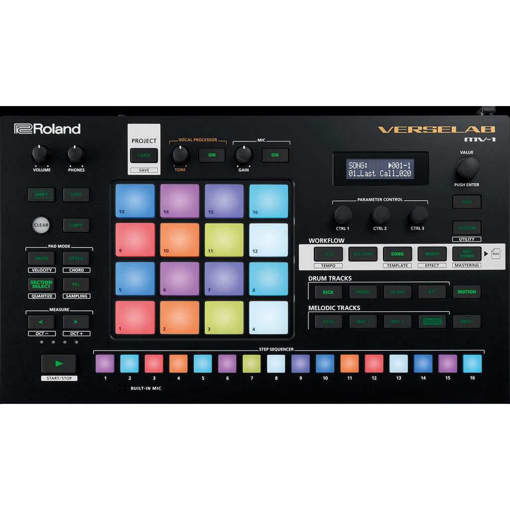 Finish more music. When inspiration strikes, VERSELAB helps you capture, refine, and finish your ideas. The fluid, hands-on workflow simplifies music making with modern vocal recording, pattern generators, thousands of ZEN-Core sounds, mastering effects, and more. Plug-and-play integration with Roland’s Zenbeats app expands your production capabilities using your computer or mobile device.* -Finish complete songs with inspiring hands-on workflow -Record vocals with modern effects like Auto-Pitch, Harmonizer, and Doubler -Curated collection of over 3000 sounds for modern styles from the makers of the TR-808 -4x4 pads and TR-REC step sequencer for drums, basslines, and melodic parts -Songwriting tools and generators get you started and keep you flowing -Interface with your smartphone, tablet, or computer for easy file transfer -Plug-and-play integration with Roland Zenbeats app expands your production capabilities* -High-quality mixing and mastering effects for pro results -Make music on the move with power via a mobile battery or USB -Built-in mic and XLR mic input with phantom power -Stereo ¼-inch I/O, dual headphones jacks, and MIDI I/O Hit the ground running. Music production can require a lot of time, money, and expertise. And for many new producers, it’s hard to know where to begin. VERSELAB has everything you need to make radio-ready tracks without all the complications, so you can focus on what matters most—your music. From intro to outro. If you’re a vocalist, beatmaker, or both, it’s easy to create complete songs with VERSELAB, regardless of your skill level. Move fluidly from ideas to beats, hooks, and your listeners’ ears with song templates, pattern generators, and a guided workflow that keeps you on track. Whether you’re just getting started, getting lost with too many options, or need to take a sledgehammer to writer’s block, VERSELAB is there to keep it moving. Bars meet beats. VERSELAB is designed for modern music making and vocal recording. The high-quality XLR mic input makes it easy to record vocals with built-in effects like Auto-Pitch, Harmonizer, Doubler and more. Just plug in a mic, dial in the sound, and go. With 16 easy access takes and the ability to copy them anywhere in your song, arranging is a snap. Sounds from the source. For songs to knock, you need the best sounds available. Roland’s sound has helped define hip-hop and other modern genres for decades, from the TR-808 to the SP-404. This sonic legacy is packed into VERSELAB, with over 3000 curated sounds that hit the spot. Get more with ZEN-Core. VERSELAB uses our most advanced sound engine—the ZEN-Core Synthesis System. It’s at the heart of our professional synthesizers and ensures top-notch sound quality. With Roland Cloud, you can expand the onboard library with thousands of new tones, including genre-specific Sound Packs to keep your music fresh. Hands-on music making. Go beyond the mouse and keyboard with VERSELAB’s inspiring RGB-lit pads and hands-on controls. Combining the TR-REC step sequencer found in legendary Roland drum machines with an ultra-responsive 4x4 pad matrix, you can bang out drum tracks, basslines, and melodic parts as fast as they come to you. Plug-and-play with Zenbeats. With expanding plug-and-play Zenbeats integration, you can connect VERSELAB to your computer, tablet, or smartphone for another level of production capability. Mix your VERSELAB songs or bounce tracks in Zenbeats, use plug-in instruments and effects, and much more via a simple USB connection. *Zenbeats integration available February 2021 Collab and connect. VERSELAB is compact, portable, and can be powered by a mobile battery, so you can make tracks just about anywhere. Collaborate in person or remotely by sharing projects or tapping into the cloud storage features of Zenbeats. When your song is ready, mix and master directly from VERSELAB, then connect your mobile device and upload to your favorite music platform or social channels. Specifications Sound Generator ZEN-Core (Tone, Drum Kit) Track Type Tone, Drum Kit, Looper (Audio Loop) Maximum Polyphony ZEN-Core: 128 voices (varies according to the sound generator load) Looper: 8 (varies according to the available number of Looper track) Vocal Take: 16 (varies according to the vocal take size) Tracks 7 tracks and 1 vocal track Sections 16 sections Vocal Take 16 takes Tones Preset Tone: 3,000 or greater Preset Drum Kit: 80 or greater User Sample (as a Tone or Drum Kit): available by importing from SD card Looper Sample (as a clip of Looper track): available by importing from SD card, recording via EXT IN/Tracks * Available total time for User Sample and Vocal take: 12 minutes in mono, 6 minutes in stereo (44.1kHz) * Available format of User Sample: WAV 32--96kHz/16-bit, 24-bit (mono, stereo) * Available total time for Looper Sample: Approx. 60 sec (44.1kHz) * Available format of Looper Sample: WAV 44.1kHz/16-bit, 24-bit, 32-bit, 32-bit float (mono, stereo) Effects Track Multi-Effects: 90 types Track EQ Chorus/Delay: 9 types Reverb: 7 types Master Effects: 90 types Master Compressor Master EQ Step Sequencer Maximum Step: 128 steps * Available on a Tone or Drum Kit Track Looper Time Stretch, Pitch Shift * Available on a Looper Track Display 16 characters, 2 lines LCD (with backlit) External Storage SD card (SDHC supported) for saving Project Data and Audio Data Connectors PHONES jacks: Stereo 1/4-inch phone type, Stereo miniature phone type MIX OUT (L/MONO, R) jacks: 1/4-inch phone type EXT IN (L/MONO/MIC, R) jacks: 1/4-inch phone type MIC IN: XLR type (phantom power: +48 V, 10 mA Max.) MIDI (IN, OUT1) connectors USB port: USB B type (Audio, MIDI) DC IN jack Power Supply AC adaptor Obtained via USB port (USB bus power) Current Draw 2,000 mA (AC adaptor) 500 mA (USB bus power) Accessories Leaflet "Read Me First" AC adaptor SD card (installed in the product when shipped from the factory) SD card protector Size and Weight Width 354 mm 13-15/16 inc