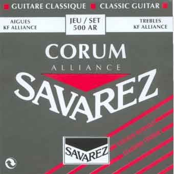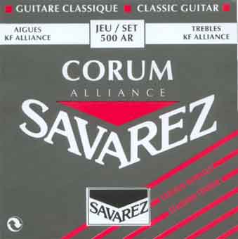 Savarez 500 AR Corum Alliance Classical Guitar Strings Normal Tension Trebles - KF ALLIANCE plain composite trebles monofilament (so called carbon strings) These strings are made of the now well-known composite monofilament ALLIANCE KF (some people call them carbon strings) , exclusive to Savarez .Years of research have been necessary to adapt this material to the demands of the musicians and to get an outstanding product : a revolution for the guitar players ! Basses - CORUM stabilon multifilament (specifically treated nylon) wound basses with rust protected silver plated metal These silver plated wound basses represent a second revolution in the world of guitar (KF ALLIANCE composite fibre trebles being the first revolution). They are the only one to offer an exceptional flexibility associated with the proper stiffness. They also offer an improved pliability compared to the traditional strings.