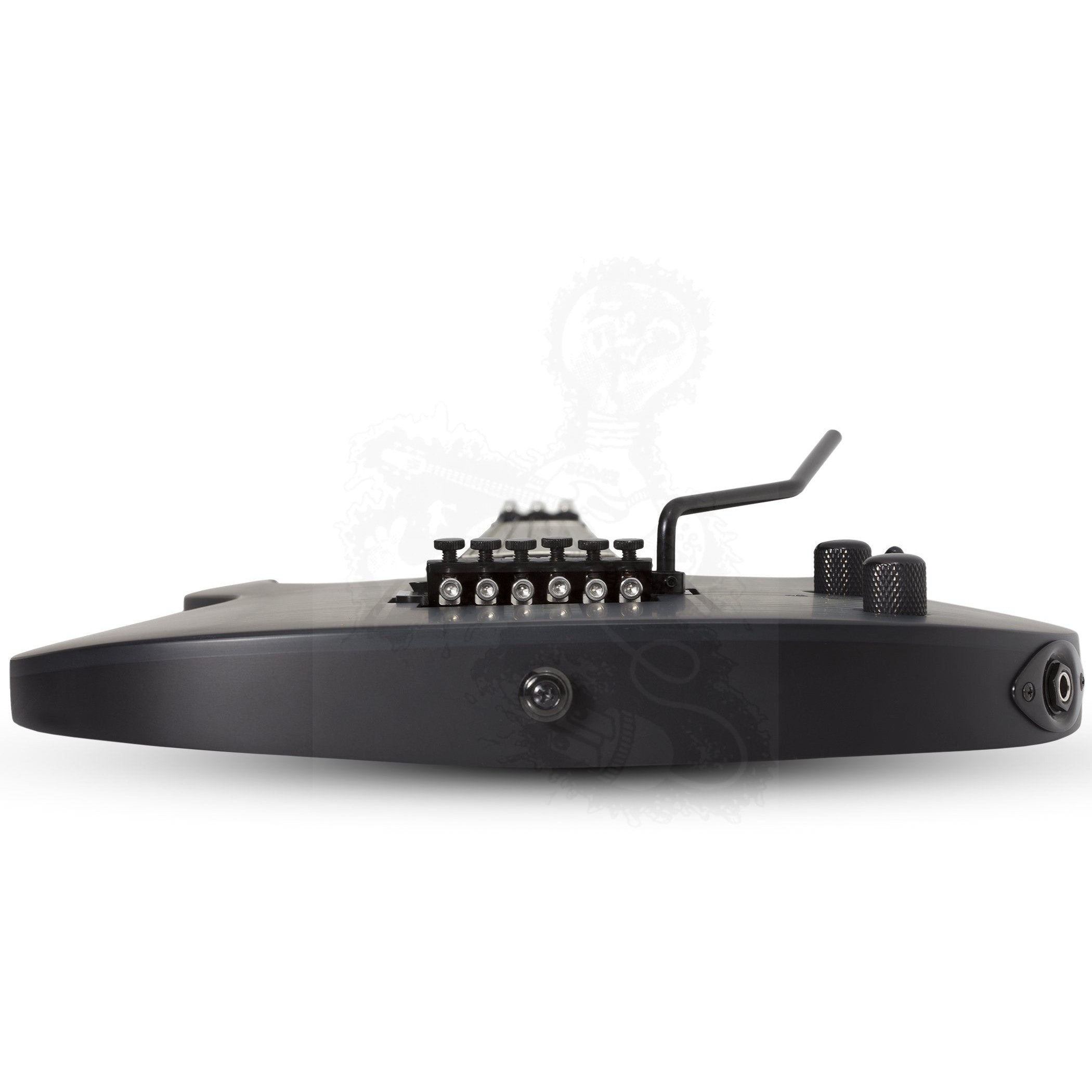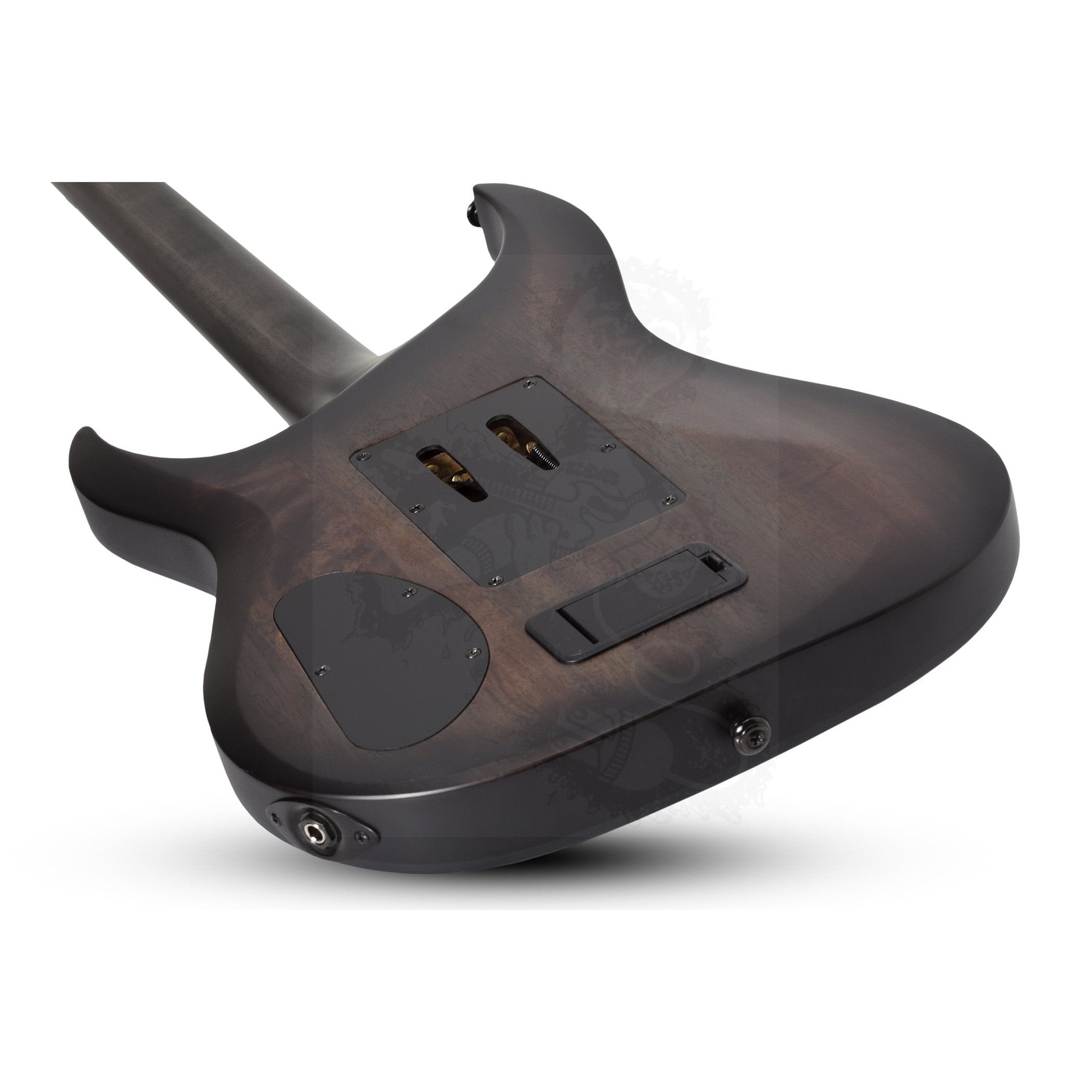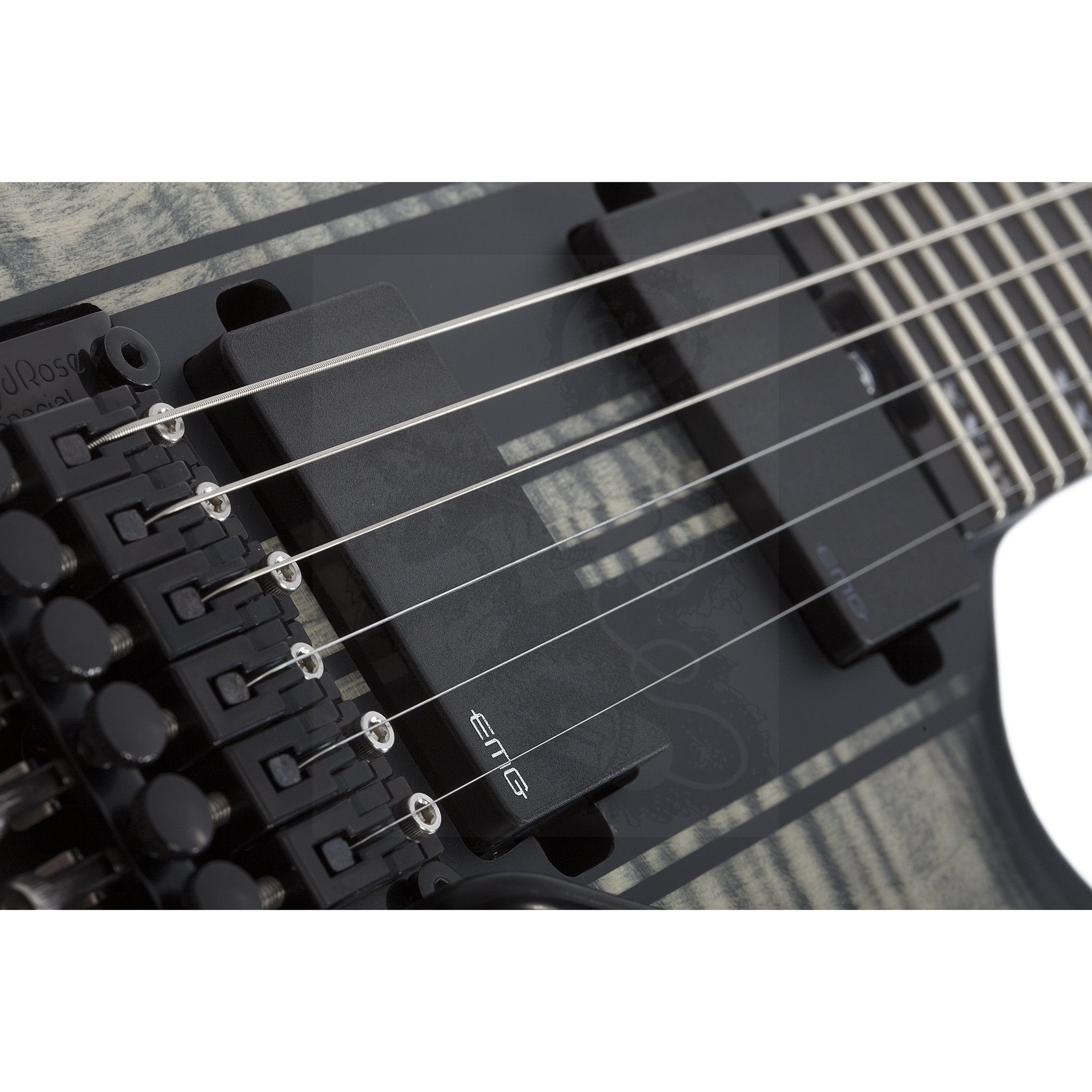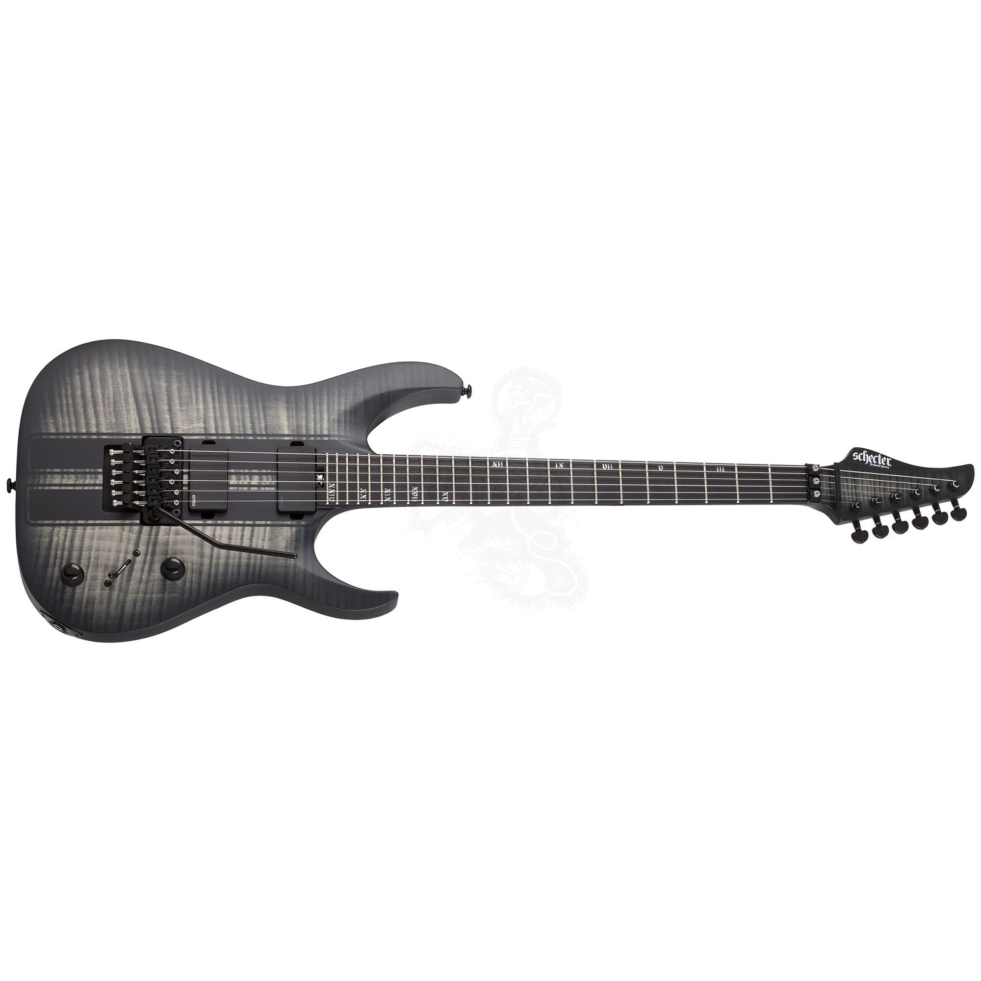 Neck Tuners: Schecter Fretboard: Ebony Neck Material: Maple 3-pc w/ Carbon Fiber Reinforcement Rods Inlays: Offset/Reverse Roman Numerals Scale: 25.5” (648mm) Neck Shape: Ultra Thin ‘U’ Thickness: @ 1st Fret- .748” (19mm)/ @ 12th Fret- .787” (20mm) Frets: 24 X-Jumbo Fretboard Radius: 14” (355mm) Nut: Floyd Rose Special Nut Width: 1.625” (41.3mm) Truss Rod: 2-Way Adjustable Rod w/ Heel Access Spoke Wheel Body Guitar Colors: Satin Charcoal Burst (SCB) Hardware Color: Black Top Contour: Radius Top Dexterity: Right Handed Construction: Set-Neck w/Ultra Access Body Material: Mahogany Top Material: Flamed Maple Binding: Black 1-ply Bridge: Floyd Rose Special 'Hot Rod' Locking Tremolo (Schecter Exclusive) Electronics Controls: Volume/Tone/3-Way Switch Bridge Pickup: EMG 81 Neck Pickup: EMG 60 Battery Compartment: 9-volt Clip-in Battery Compartment Accessories Knobs: Metal Knurled w/ Set Screw Strings: Ernie Ball Regular Slinky #2221 (.010-.046) Case: SGR-1C "Case Sold Separately"