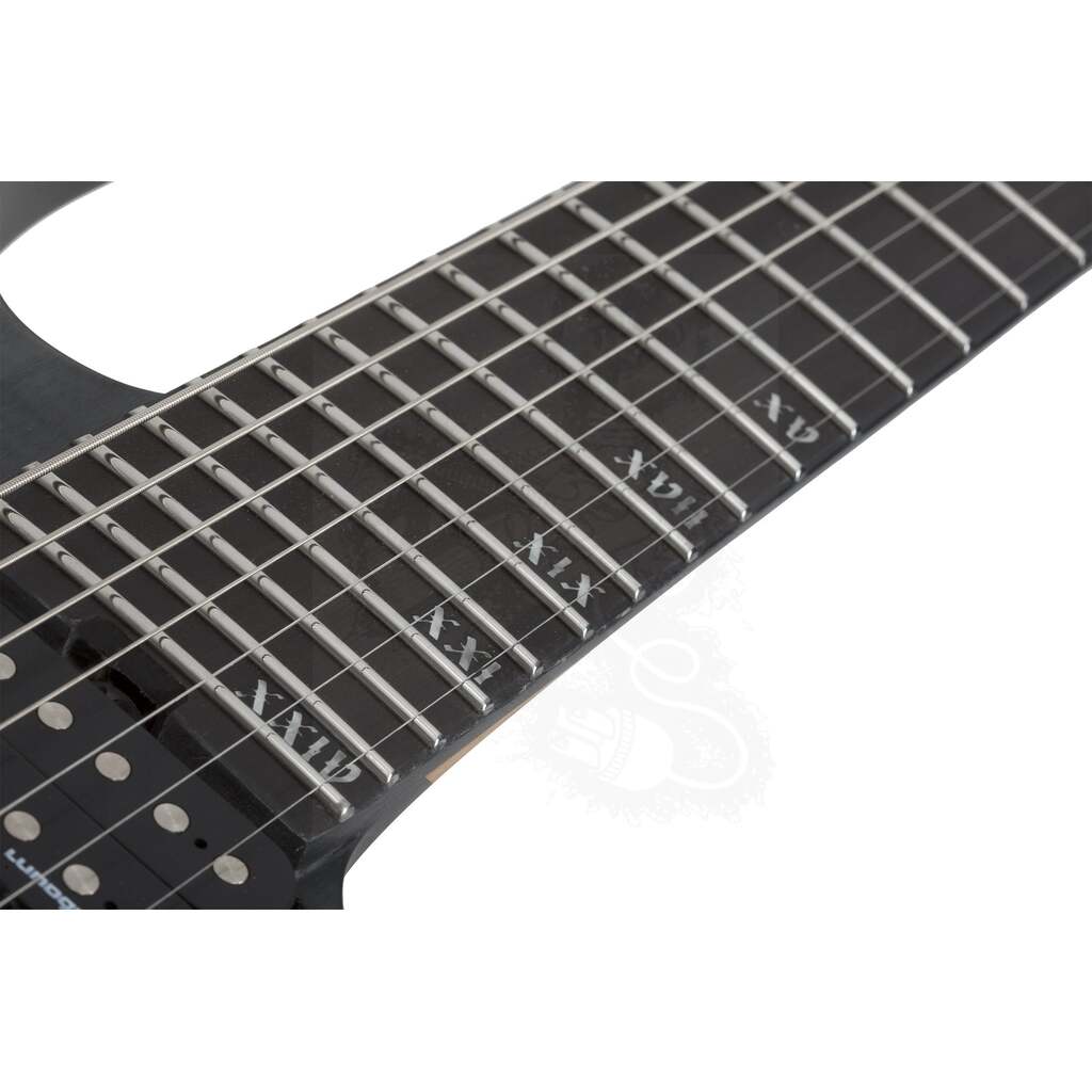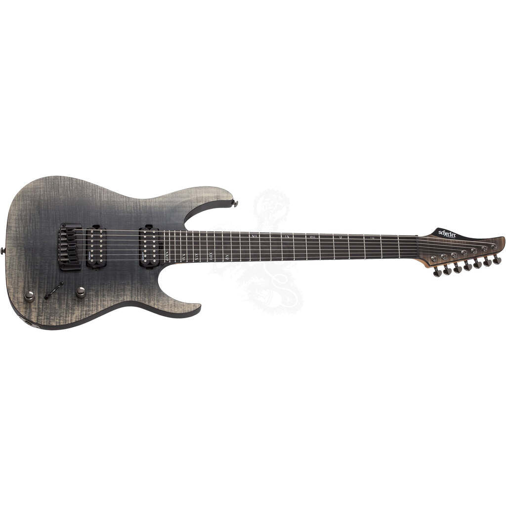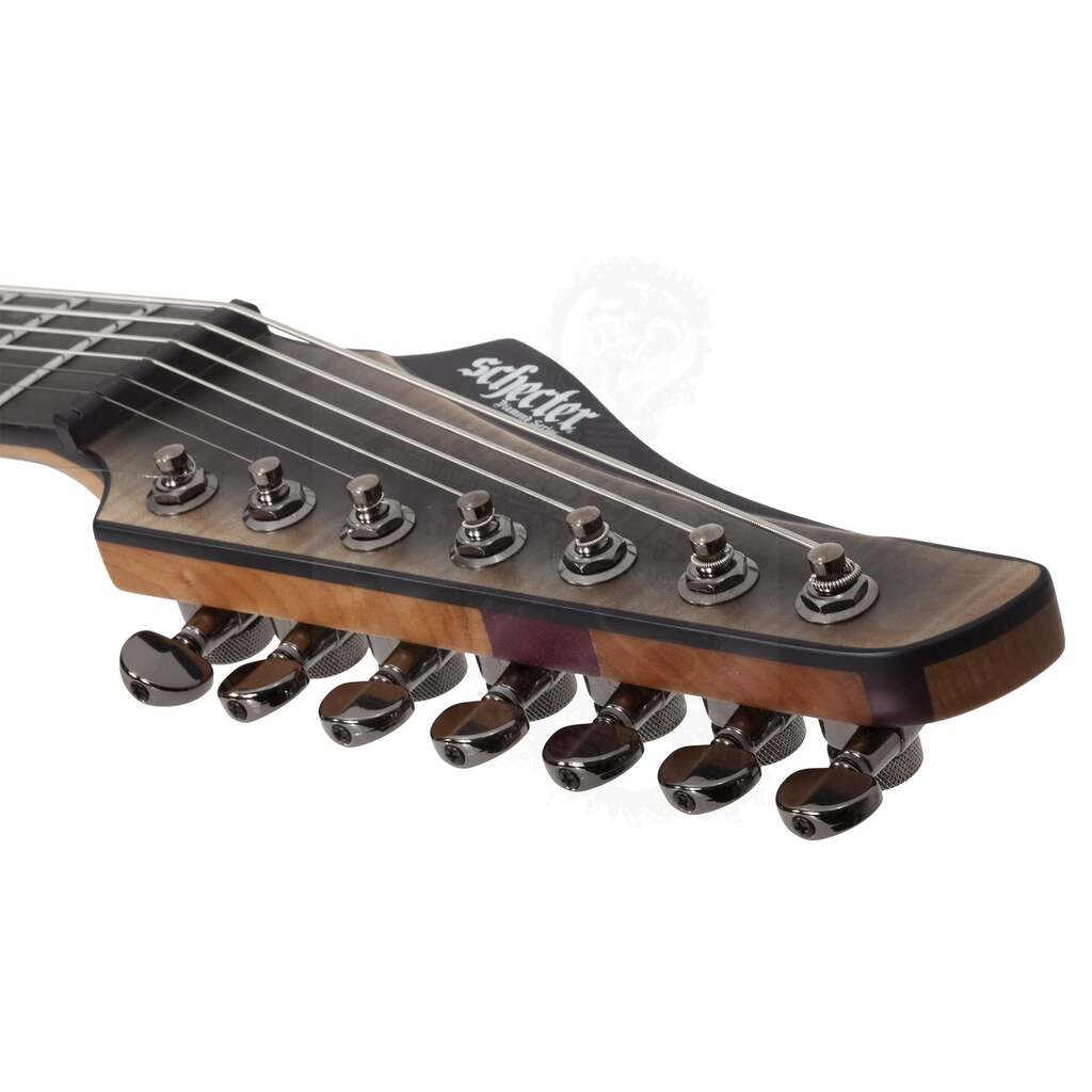Neck Tuners: Schecter Locking Fretboard: Ebony Neck Material: Roasted Maple/Purpleheart Multi-ply with Carbon Fiber Reinforcement Rods Inlays: Offset/Reverse Roman Numerals Side Dot Markers: Luminlay Glow in the Dark Scale: 26.5” (673mm) Neck Shape: Ultra Thin ‘U’ Thickness: @ 1st Fret- .748” (19mm)/ @ 12th Fret- .787” (20mm) Frets: 24 X-Jumbo Stainless Steel Fretboard Radius: 12”-16” Compound Radius Nut: Graph Tech XL Black Tusq Nut Width: 1.889” (48mm) Truss Rod: 2-Way Adjustable Rod w/ Heel Access Spoke Wheel Body Guitar Colors: Fallout Burst (FOB) Hardware Color: Black Chrome Top Contour: Radius Top Dexterity: Right Handed Construction: Neck-Thru w/Ultra Access Body Material: Swamp Ash Top Material: Flamed Maple Binding: Black 1-ply Bridge: Hipshot Ibby HM Guitar Bridge Electronics Controls: Volume/Tone (Push-Pull)/3-Way Switch Bridge Pickup: Lundgren M7 Neck Pickup: Lundgren M7 Accessories Knobs: Metal Knurled w/ Set Screw Strings: Ernie Ball 7-String (.009/.011/.016/.026/.036/.046/.062) Case: SGR-1C "Case Sold Separately"