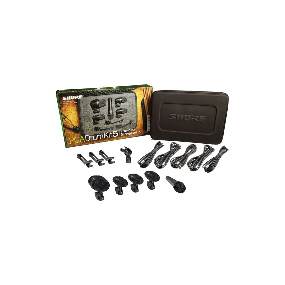The PGADRUMKIT5 Drum Microphone Kit is an essential package of professional quality microphones designed to provide excellent sound for close-mic kick drum, snare and tom performance and recording. Microphone Type Dynamic Polar Pattern Cardioid Frequency Response Tailored Form Factor Mountable Model Line PG ALTA Applications Drums / Percussion Available Options PGADRUMKIT5 5-Piece drum microphone kit with 1 PGA52, 3 PGA56, 1 PGA57, A25D stand adapter, 3 AP56DM drum mounts, 5 XLR-XLR cables, case.