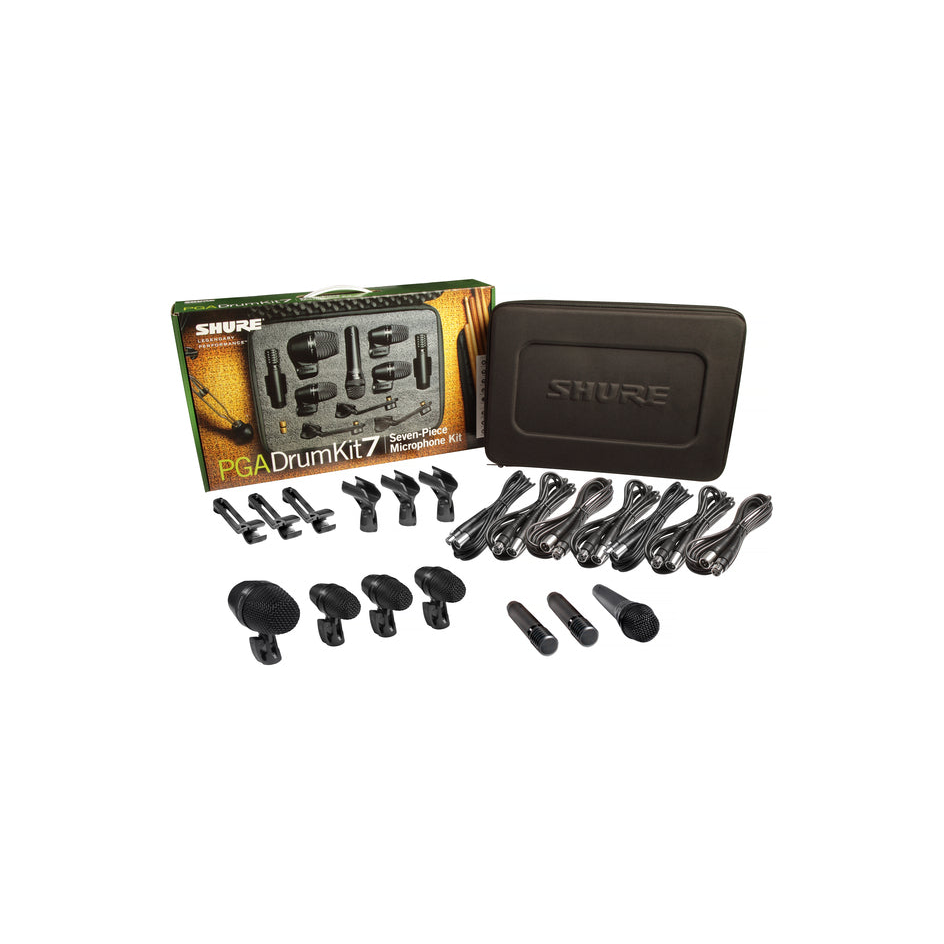 The PGADRUMKIT7 Drum Microphone Kit is a complete package of professional quality microphones designed to provide excellent sound for full drum kit performance and recording. Microphone Type Condenser Dynamic Polar Pattern Cardioid Frequency Response Flat Tailored Form Factor Mountable Model Line PG ALTA Applications Drums / Percussion Available Options PGADRUMKIT7 7-Piece drum microphone kit with 1 PGA52, 3 PGA56, 1 PGA57, 2 PGA81, 3 A25D stand adapters, 3 AP56DM drum mounts, 7 XLR-XLR cables, case.