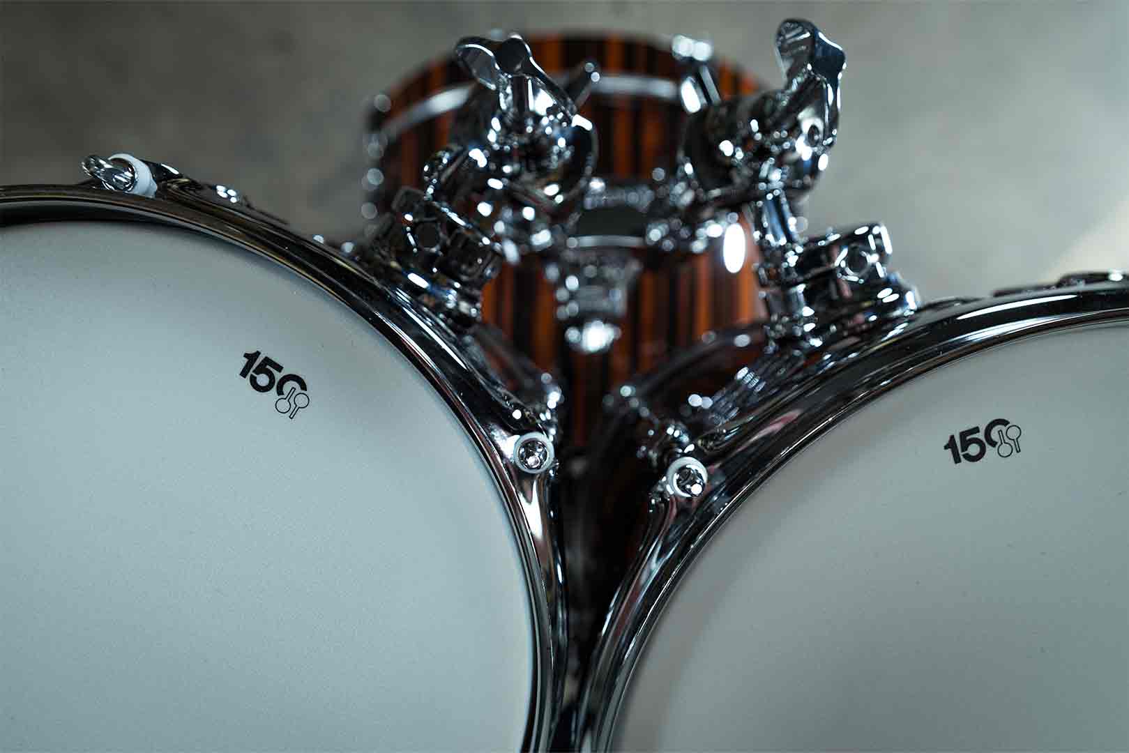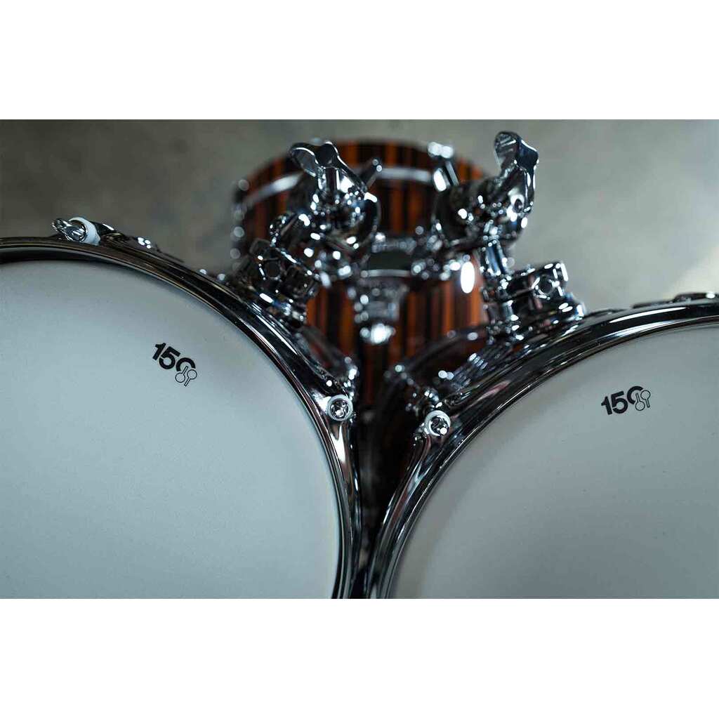 The bass drum is equiped with an exclusive black pre-dampened head, featuring our 150th Anniversary Logo.