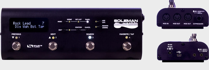 Four Footswitches—Use the footswitches to scroll through presets (ie “scenes”), launch individual MIDI messages, step through set lists, or trigger highly customizable MIDI macros. Configure footswitch functionality with any of the Soleman’s three useful control modes.