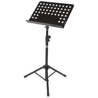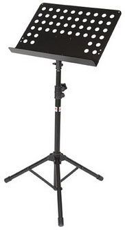 Tubular tripod stand with sturdy legs that fold easily for portability. Large steel desk has holes which reduce the overall weight of the stand. Book plate 19.5” x 15.5”. Adjustable height is 26.625” - 44.25”. 7.5 lbs. Black.