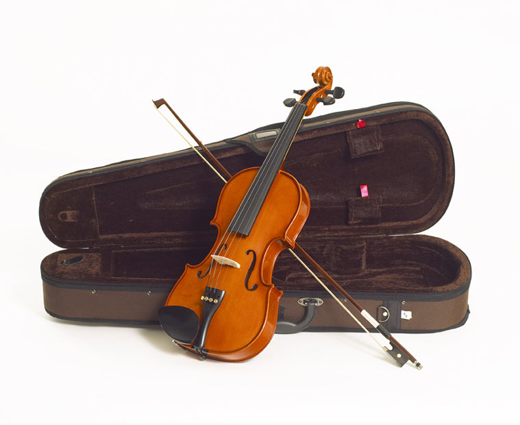 The Stentor Student Standard is an entry-level outfit for players on a budget. Unlike many other economy level instruments, it is made to correct measurements and specifications. The outfit comes with a well-constructed lightweight case with brown integral cover and a good student wood bow. The violin is made from carved solid tonewoods, with inlaid purfling and blackened hardwood pegs and fingerboard. It is fitted with a textured plastic tailpiece with integral adjusters for easy tuning. It offers amazing value and should not be confused with low quality pressed timber instruments that have a short useable life. Sizes: 4/4, 3/4, 1/2, 1/4, 1/8, 1/10, 1/16