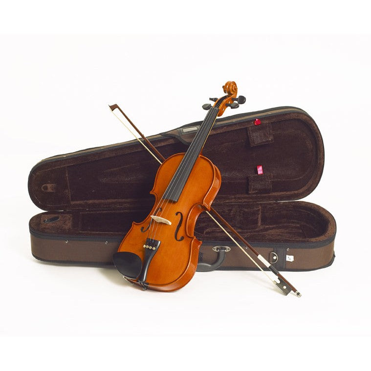 The Stentor Student Standard is an entry-level outfit for players on a budget. Unlike many other economy level instruments, it is made to correct measurements and specifications. The outfit comes with a well-constructed lightweight case with brown integral cover and a good student wood bow. The violin is made from carved solid tonewoods, with inlaid purfling and blackened hardwood pegs and fingerboard. It is fitted with a textured plastic tailpiece with integral adjusters for easy tuning. It offers amazing value and should not be confused with low quality pressed timber instruments that have a short useable life. Sizes: 4/4, 3/4, 1/2, 1/4, 1/8, 1/10, 1/16