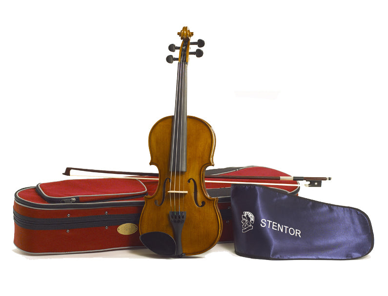 The Stentor Student II violin is recommended by teachers and music services for its quality and reliability. The violin is made from solid tonewoods, in Stentor's unique workshop environment, producing an instrument with good tone, a responsive sound and reliable performance. The pegs, nut and saddle are ebony and the violin is fitted with branded flexible core strings and a quality composite tailpiece with integral adjusters. All our instruments have inlaid purfling. The Stentor Student II is the ideal violin for the beginner and comes complete with a lightweight case with burgundy red integral cover with safety reflectors: fitted interior with accessory pocket, two bow holders and case blanket; carrying straps, full lid music pocket and external shoulder rest pocket. It also includes a good quality student wood bow with natural horsehair and full mounted ebony frog Sizes: 4/4, 3/4, 1/2, 1/4, 1/8, 1/10, 1/16