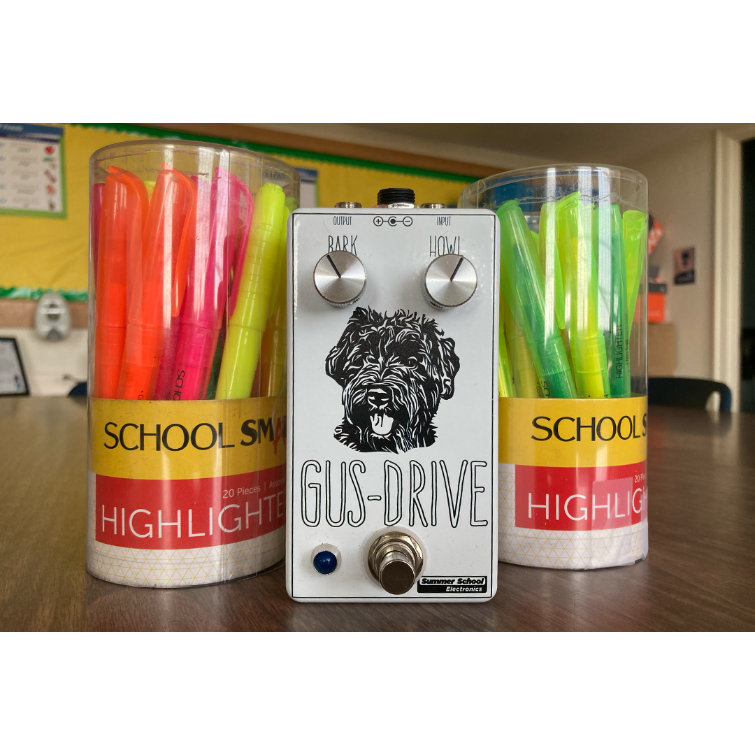 The Gus-Drive is the first offering from Summer School Electronics. It is a high-gain hard clipping overdrive that will make your amp sing and howl. The Gus-Drive sports two knobs labeled Bark (volume) and Howl (gain) and has a unique feature that rolls off low frequencies as the gain is increased allowing your guitar to stand out in a band setting.
