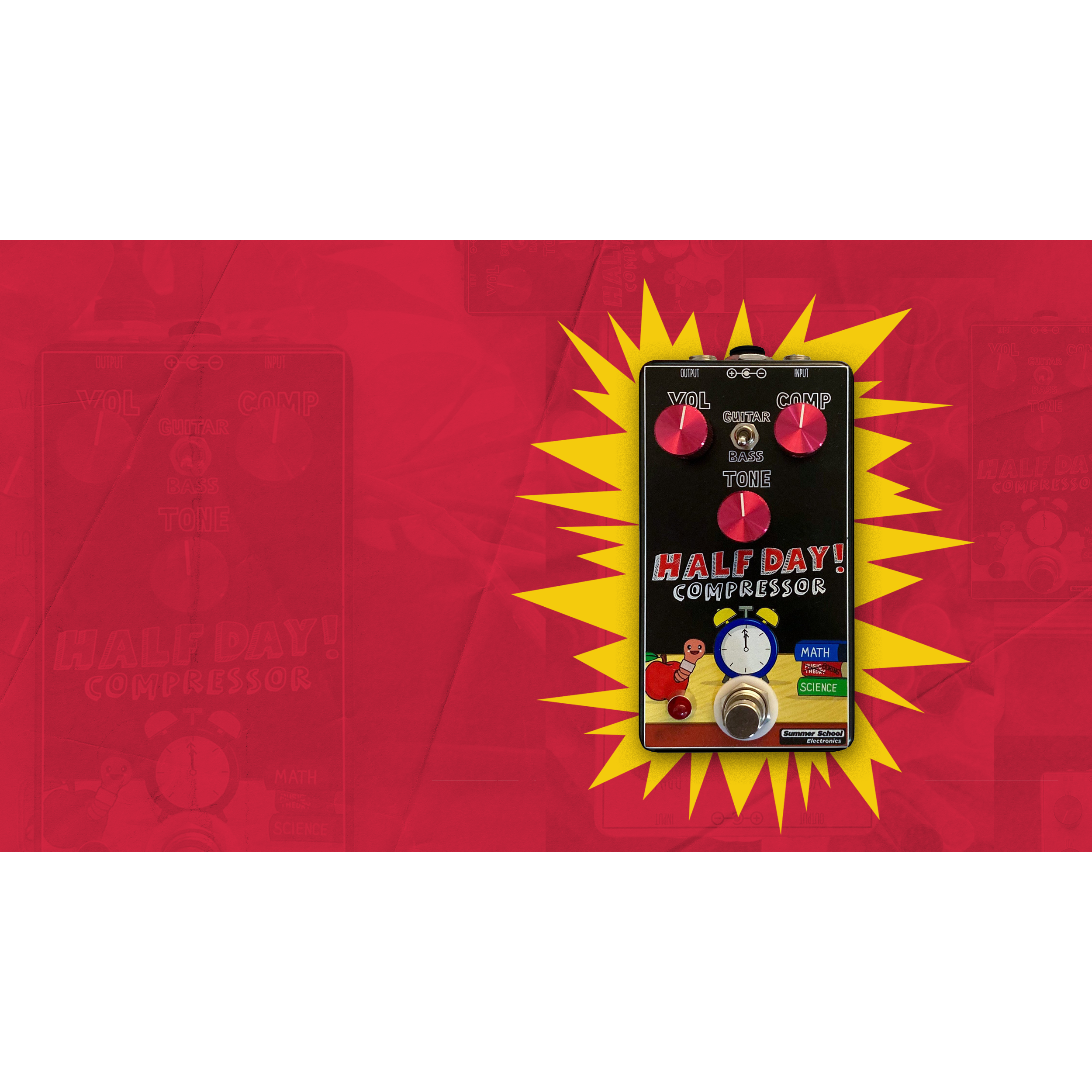 The Half Day Compressor from Summer School Electronics is a Ross-style compressor that boasts some modern amenities for today’s player.  This compressor will level out your playing preventing any volume spikes while playing and raising any notes that are softer than the desired level for a smooth compressed sound.  This is especially helpful when playing individual notes from string to string, or fingerpicking.  The most notable upgrade is the toggle switch from Guitar to Bass which changes input capacitance.  In “Guitar” mode, the lower frequencies are rolled off allowing the compressor to stand out in a band mix.  In the “Bass” setting more lower frequencies are allowed to pass through making it ideal for bass, synths, baritone and drop tuned guitars.  Other features include a tone control to further dial in the ideal sound based on music genre, and an included boost which allows the played to achieve the “squashed” compressor sound at higher volumes for solos. The Half Day runs on a standard 9-volt, neg. center power supply, and has a lifetime warranty.  Hand built in Syracuse, NY by working musicians with attention to detail.