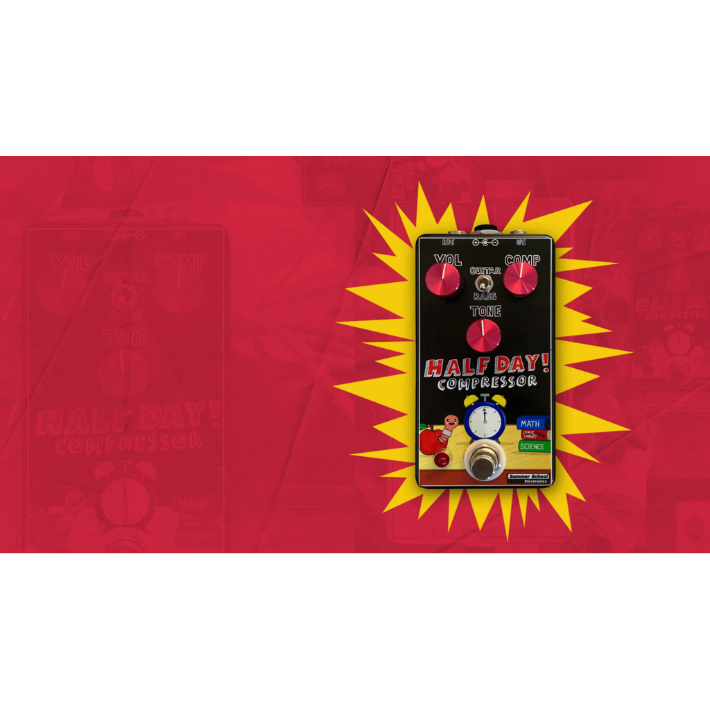 The Half Day Compressor from Summer School Electronics is a Ross-style compressor that boasts some modern amenities for today’s player. This compressor will level out your playing preventing any volume spikes while playing and raising any notes that are softer than the desired level for a smooth compressed sound. This is especially helpful when playing individual notes from string to string, or fingerpicking. The most notable upgrade is the toggle switch from Guitar to Bass which changes input capacitance. In “Guitar” mode, the lower frequencies are rolled off allowing the compressor to stand out in a band mix. In the “Bass” setting more lower frequencies are allowed to pass through making it ideal for bass, synths, baritone and drop tuned guitars. Other features include a tone control to further dial in the ideal sound based on music genre, and an included boost which allows the played to achieve the “squashed” compressor sound at higher volumes for solos. The Half Day runs on a standard 9-volt, neg. center power supply, and has a lifetime warranty. Hand built in Syracuse, NY by working musicians with attention to detail.