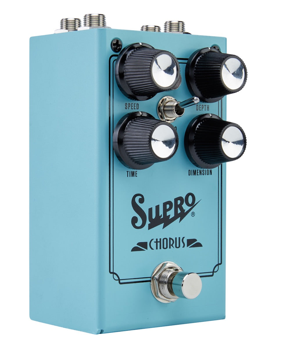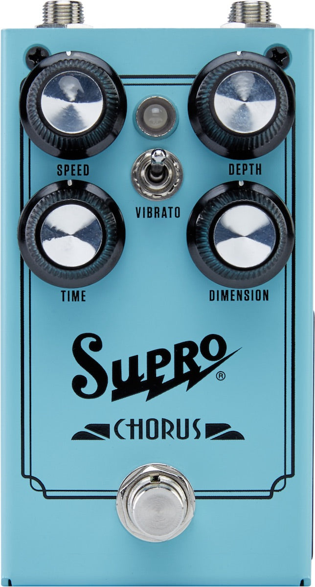 The Supro Chorus is an all-analog, full-stereo modulation stompbox that uses a pair of genuine MN3007 Bucket Brigade IC chips to deliver the thickest, most luscious Chorus effect possible in pedal form, all while maintaining exceptional headroom. In addition to Speed and Depth knobs, the Supro Chorus features a Time control that increases the delay time on one side of the stereo field while shortening the delay time on the other side. Further increasing the available drama is a Dimension control, which mixes the stereo channels into one another for a mesmerizing intermingling of the two delay lines being modulated in opposite directions. A Vibrato switch removes the clean pass-through signal, allowing for pure pitch modulation with the Dimension knob, introducing a more complex, double vibrato effect. Runs on standard 9VDC.