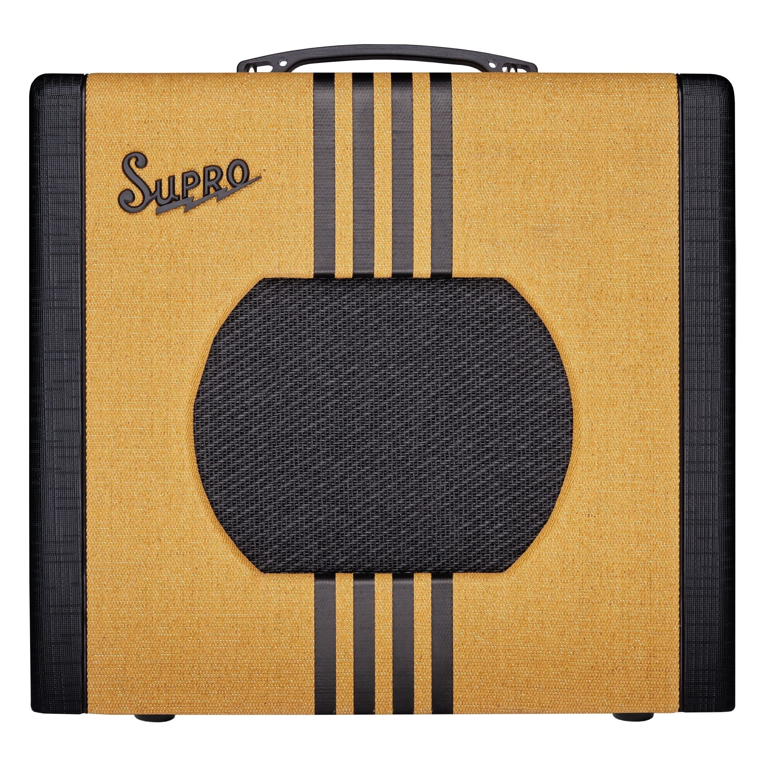Hearkening back to the original Supro combo amplifiers, the Delta King 10 features a custom, poplar cabinet design, and two unforgettable colorways: custom tweed with black stripes, and black with cream stripes.