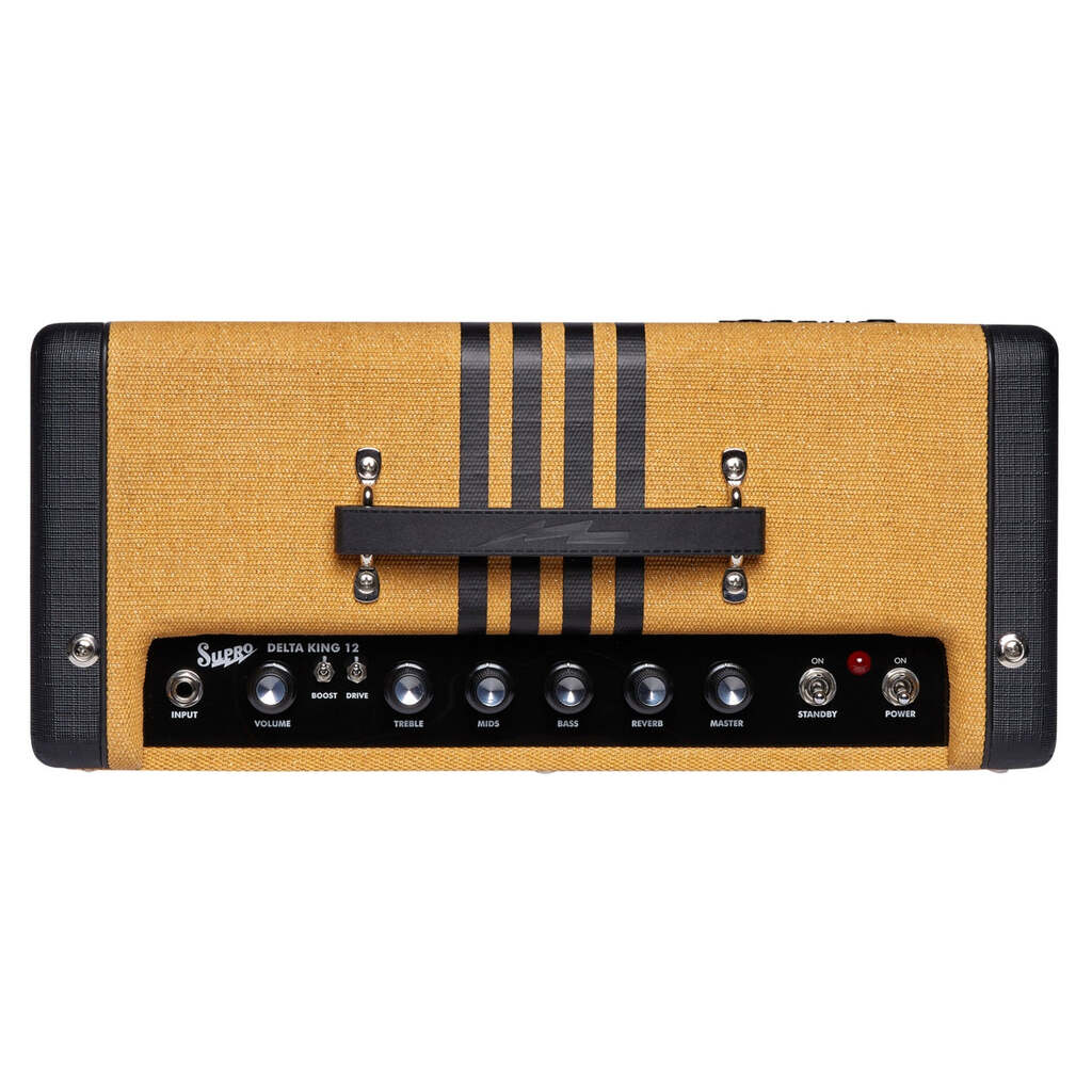 Hearkening back to the original Supro combo amplifiers, the Delta King 12 features a custom, poplar cabinet design, and two unforgettable colorways: custom tweed with black stripes, and black with cream stripes.