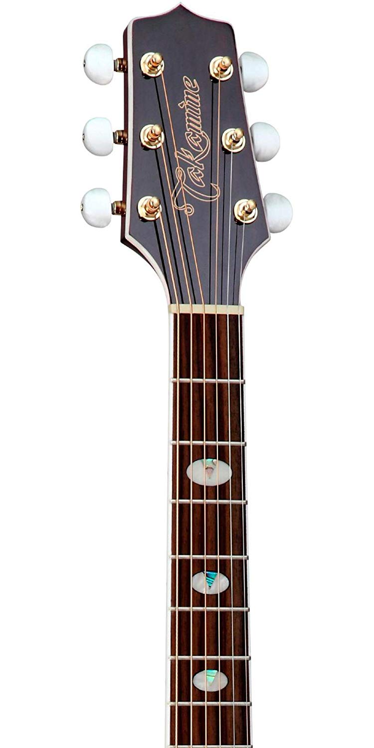 The maple neck is capped with a rosewood fingerboard with striking oval pearloid inlay patterns. The pickguard is adorned with a "Grass Flower" pattern over a black background. This guitar features Takamine's ever-reliable TP 4DT electronics, delivering stellar stage performance.