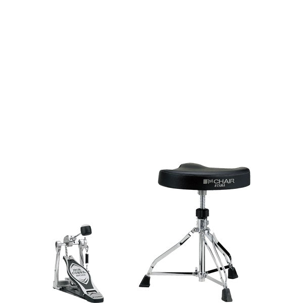 This hardware pack consists of an Iron Cobra 200 series Single Pedal and 1st Chair Saddle-Type Seat Drum Throne. Included is one (1) HP200P Single Pedal and one (1) HT250 Saddle-Type Seat Drum Throne.