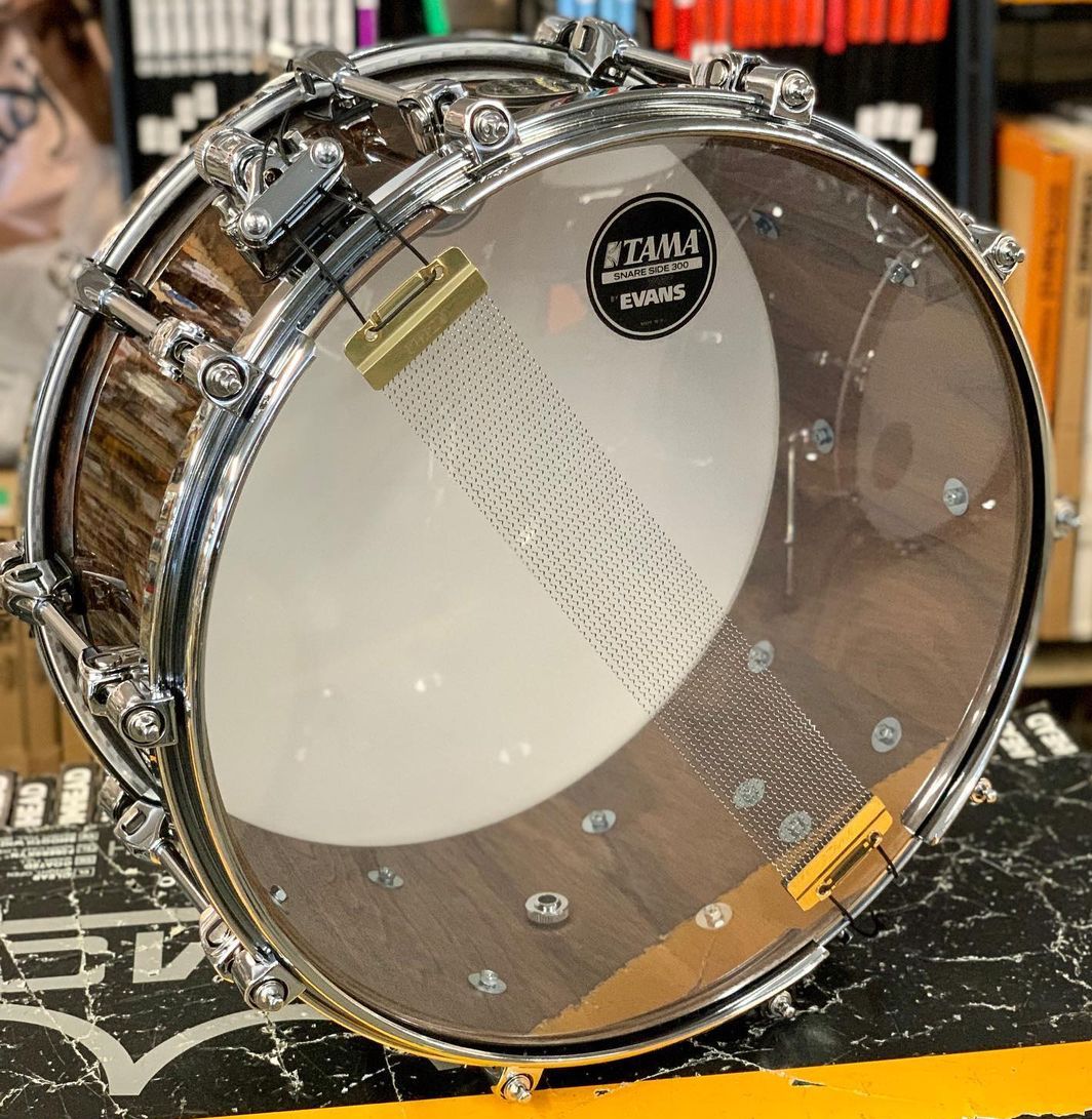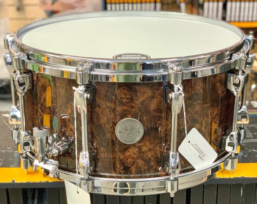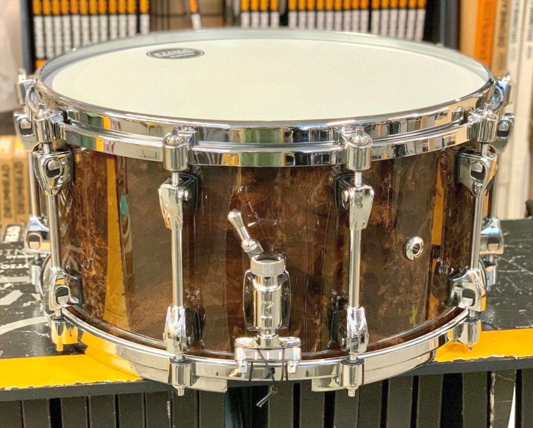 This STARPHONIC snare drum features a thin 6mm/7ply Walnut shell characterized by its uniquely warm sound and mid-low tone. The Grooved Hoop provides controlled overtones and a slightly mellow attack. The Super Sensitive Hi-Carbon Snare Wires enhance the luxurious and fat sound of the Walnut shell. Finished with a Walnut Burl outer ply in a dark natural finish, this snare looks just as gorgeous as it sounds.