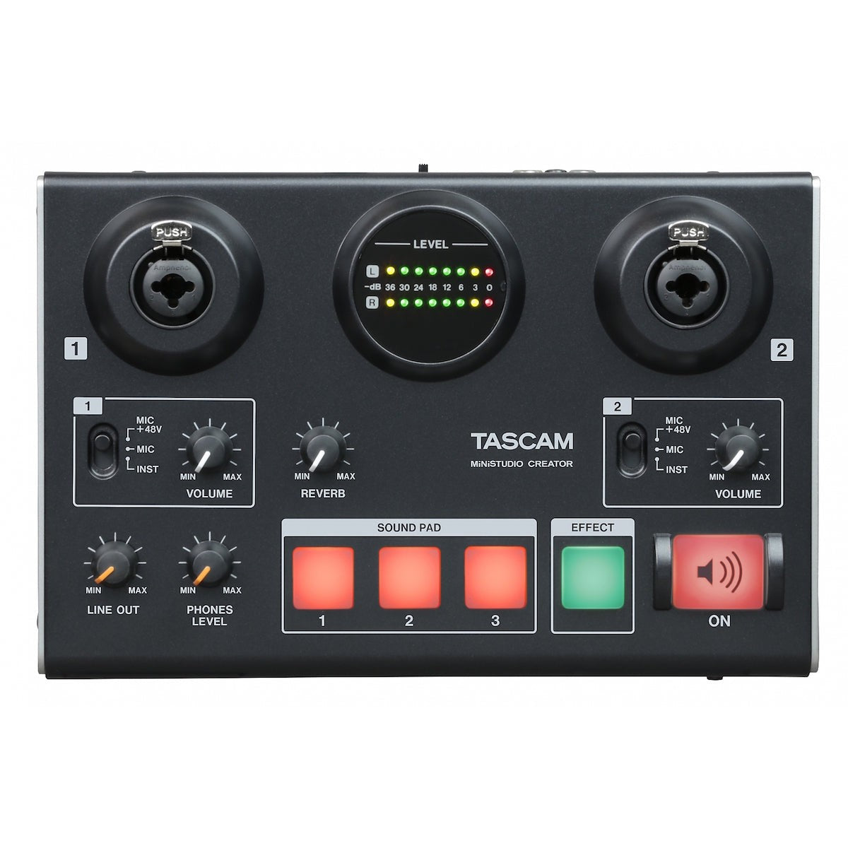 The Tascam MiNiSTUDIO Creator US-42B is a computer audio interface that has been developed to enable anyone to broadcast their programs to the world with ease. By using a dedicated device with high-quality audio circuits for mic and instrument input you lay the foundation for impressive sound in high quality. Moreover, the MiNiSTUDIO Creator offers several techniques that can make programs more interesting in order to grow your audience. Professional broadcasters, for example, call pre-recorded clapping, cheering and other sounds with a press of a button. With the Sound Pads on the MiNiSTUDIO Creator you too can trigger such sounds simply by pressing buttons. There is also a ducking function that lowers the volume of background music during announcements. And you can use voice effects and reverb to improve the atmosphere and raise the level of excitement of a program.