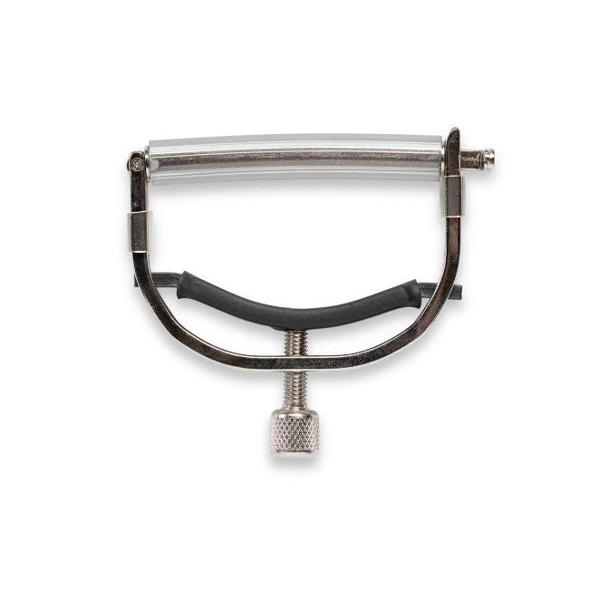 Guitar capo; around-the-neck yoke design ensures superior tone, intonation and tuning stability. Easily stored behind the nut when not in use. Ideal for wider necks. Made in USA. Model # 80494(Bright Nickel)