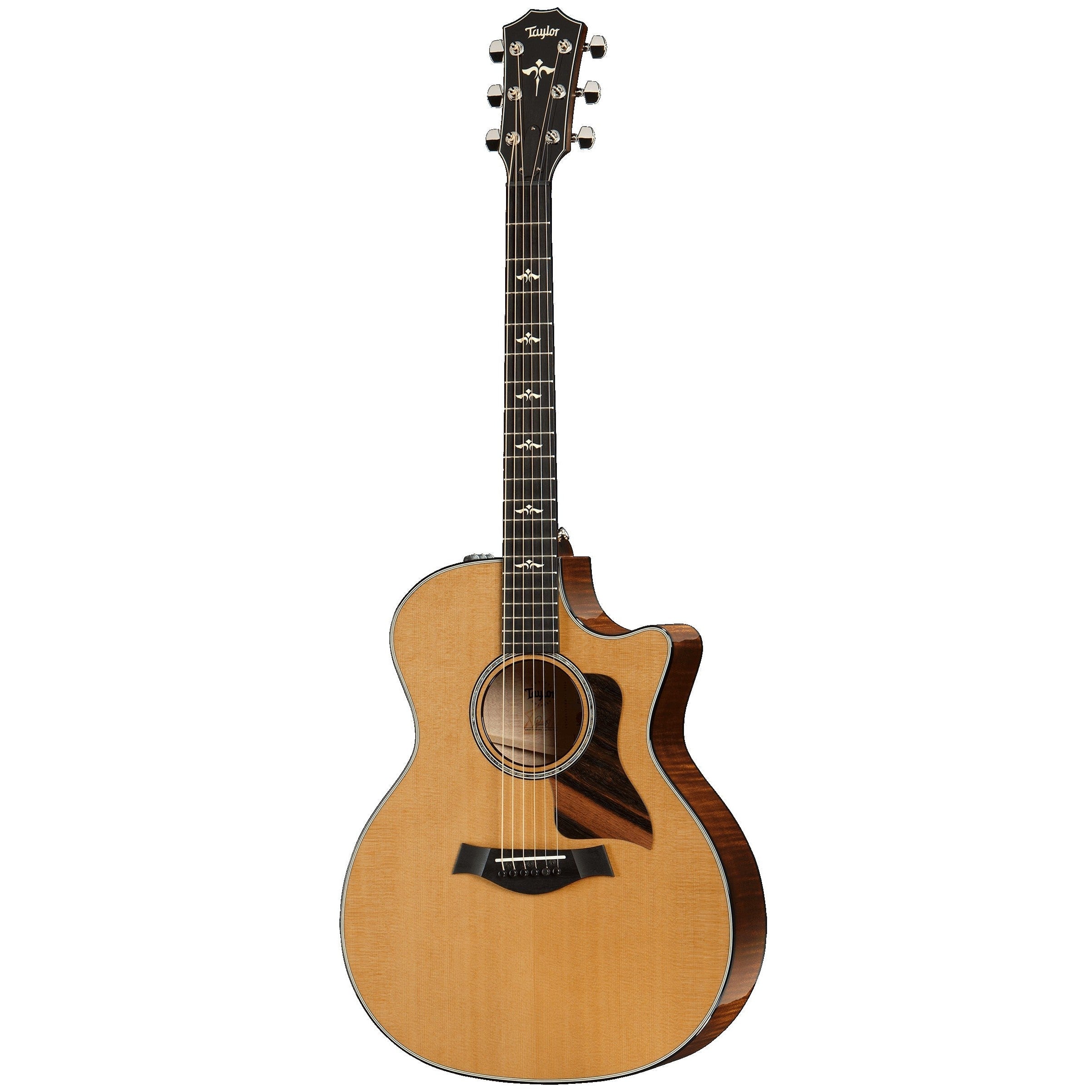 One of the distinctive traits of maple as a tonewood is its sonic transparency, which makes it wonderfully player-reflective. On this maple/spruce 614ce, a torrefied (specially roasted) Sitka spruce top and our tone-enhancing V-Class bracing take that natural versatility to a whole new level. Whatever the player brings to the guitar comes through—it can be played to sound warm or bright. The roasting process for the top elicits a more played-in tone, and together with the V-Class bracing gives the player a more expressive tool in the form of increased dynamic range, greater projection, longer sustaining notes, and more harmonic agreement with chords up the entire fretboard. The 614ce also stands out as one of the most touch-sensitive models in the entire Taylor acoustic line. Whether you play fingerstyle arrangements or strum in alternate tunings, whatever your preferred musical style, this guitar pays musical dividends on what you put into it. Aesthetic touches include a hand-rubbed Brown Sugar stain that highlights the rich figure of the maple back and sides, along with ebony binding, a paua abalone rosette trimmed with ebony and ivoroid, and our Wings fretboard and peghead inlays in grained ivoroid. The guitar ships with ES2 electronics in a deluxe hardshell case. Highlights Scale Length: 25-1/2" Nut & Saddle: Black Graphite, Micarta saddle Bracing: V-Class Truss Rod Cover: West African Crelicam Ebony Pickguard: Macassar Ebony Number of Frets: 20 Tuners: Taylor Nickel Case: Taylor Deluxe Hardshell Brown Brand of Strings: Elixir Phosphor Bronze Light Body Length: 20" Body Width: 16" Body Depth: 4 5/8" Body Binding/Edge Treatment: West African Crelicam Ebony Top Finish: Gloss 4.5 Back Config: 2 or 3 piece Backstrap Finish: Gloss Rosette Size: 2014 800 Series Bridge Inlay: None Back/Side Finish: Gloss 4.5 Armrest Binding: None Backstrap Wood: Match Binding Rosette Mat.: Ebony/Ivoroid/Paua/Ivoroid/Ebony Stain/Sunburst: Brown Sugar Wedge: None Armrest: no Neck Neck Width: 1-3/4" Fretboard Inlay: Grained Ivoroid Wings Fretboard Binding/Edge Treatment: West African Crelicam Ebony Heel Cap Binding: West African Crelicam Ebony Type of Neck Joint: Taylor Neck Neck/Heel: Tropical Mahogany Fretboard Wood: West African Crelicam Ebony Neck Finish: Satin Heel Length: 3-1/2" Peghead Peghead Finish: Gloss Peghead Binding: None Peghead Type: Standard Peghead Purfling: Ivoroid Headstock Overlay: West African Crelicam Ebony Peghead Inlay: Grained Ivoroid Wings Peghead Logo: Grained Ivoroid Other Bridge Pins: West African Crelicam Ebony Buttons: Nickel Fingerboard Ext: None Edge Trim: None *Models are subject to change without notice