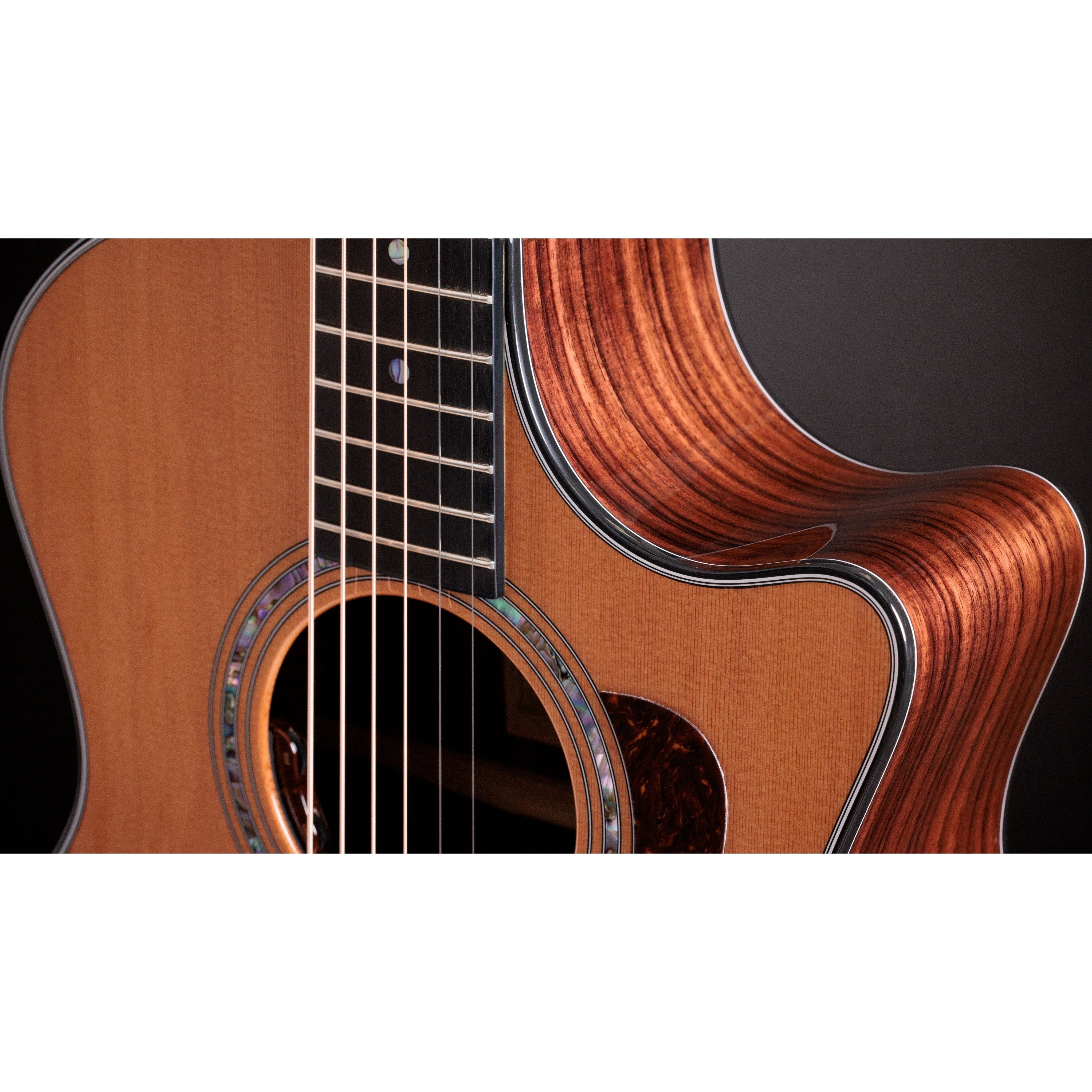 Built to honor the innovative spirit that drove Bob Taylor's guitar designs dating back to the early years, the Legacy 714ce celebrates the Grand Auditorium body shape that Bob introduced to the world in 1994. This model boasts a tonewood pairing not currently found in the standard Taylor line: Indian rosewood back and sides with a Western Red cedar top, voiced with the same X-bracing pattern used in the first Grand Auditorium guitars. The result is an exceptionally warm, mellow response with remarkable touch sensitivity that doesn't lose clarity in the treble range. Visually, this model reflects the understated aesthetic Bob preferred for his guitars of 3 decades ago, with appointments including black binding with black and white pinstripes, dot fretboard inlays in green abalone with a matching 3-ring rosette, ebony bridge pins with green abalone dots, a faux-tortoiseshell pickguard, gold tuning machines, and a gloss-finished body paired with a satin-finished neck. The Legacy 714ce features LR Baggs Element VTC electronics and ships with a deluxe hardshell case.